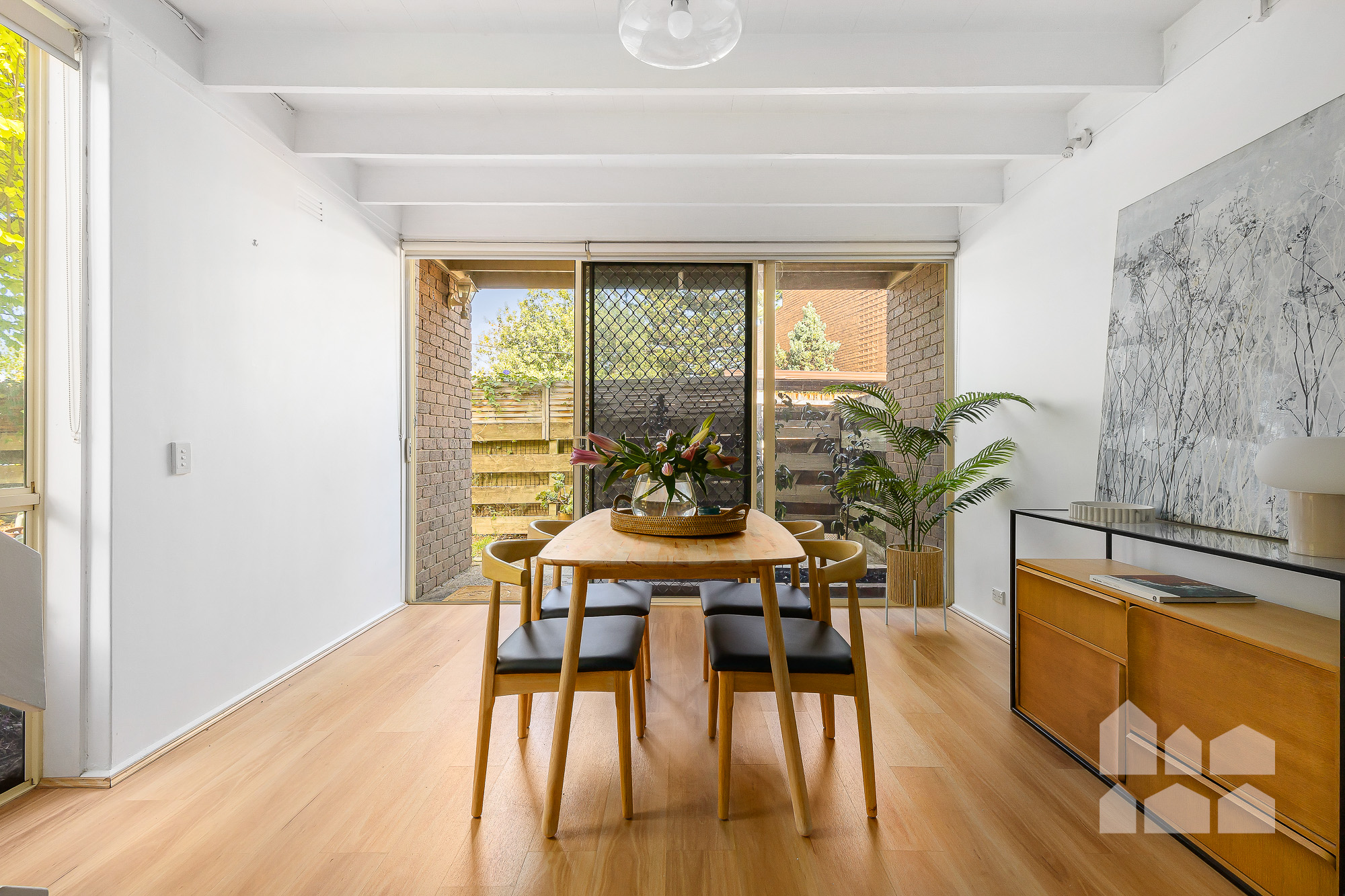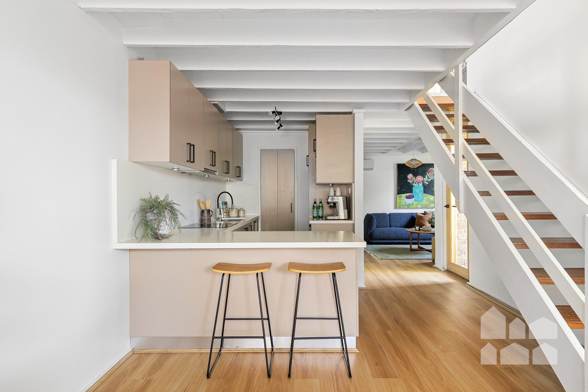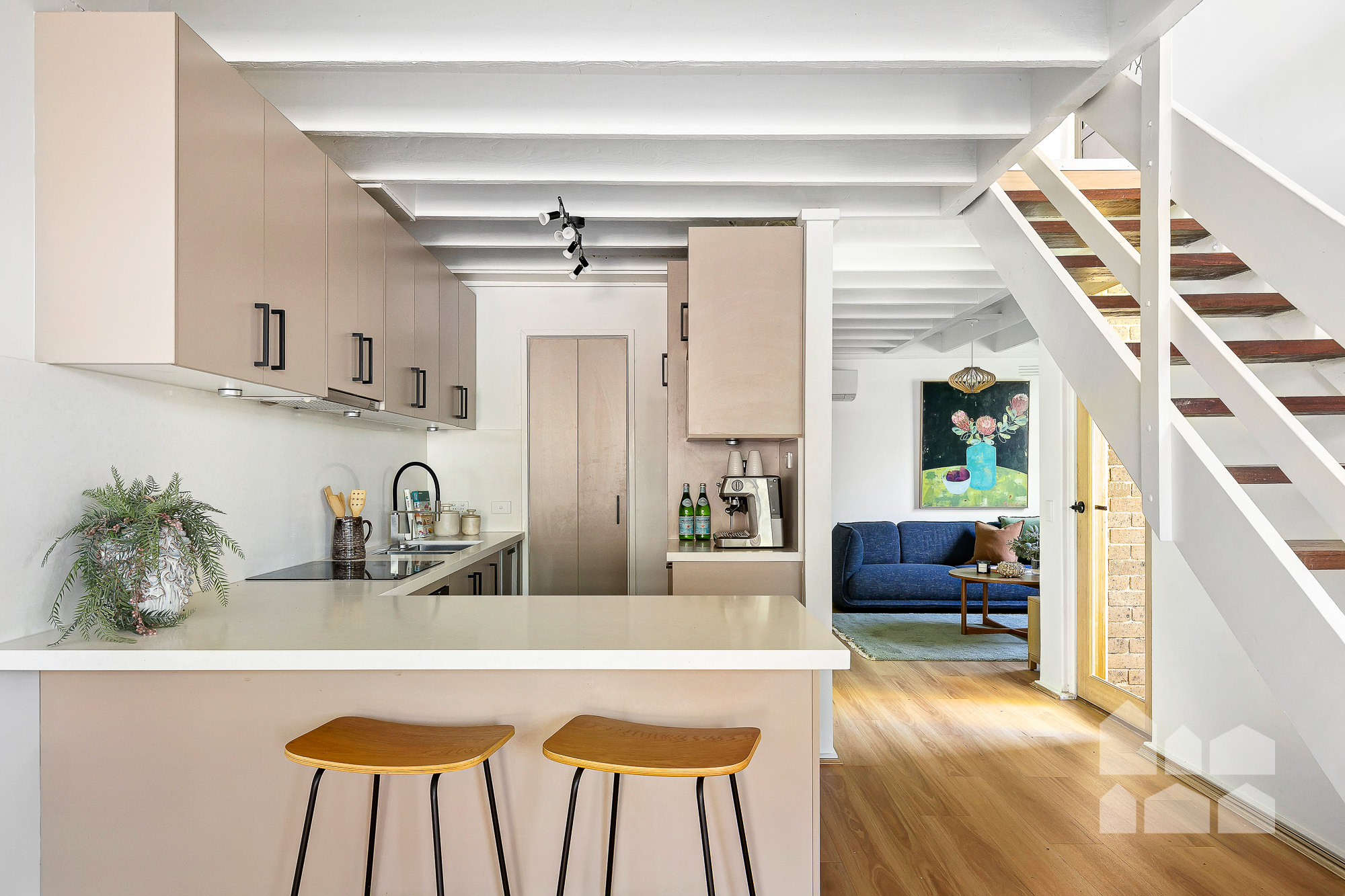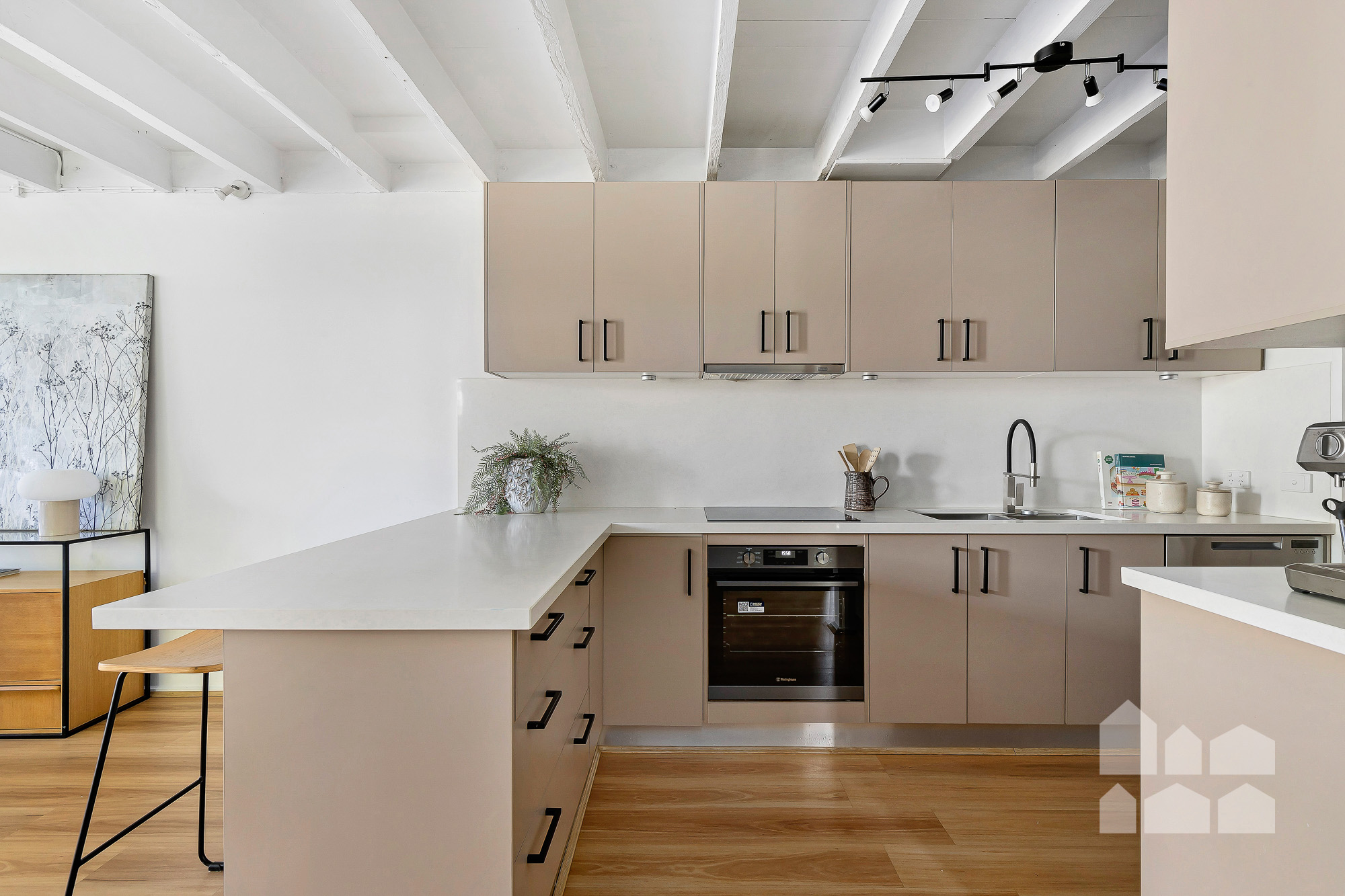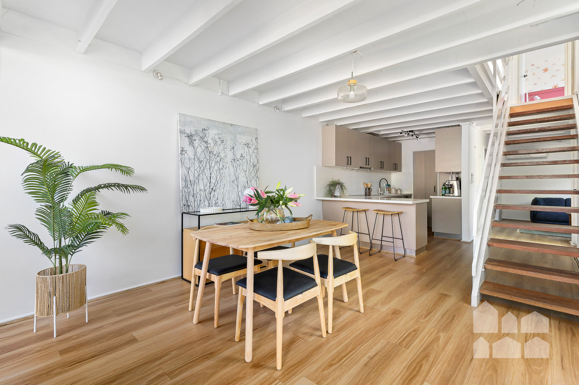 – sunny open-plan living crowned by an exposed-beam ceiling and anchored by hybrid floating floors, showcasing generous dining and lounge zones flanking a well-appointed kitchen with a walk-in pantry, electric cooking and a breakfast bar