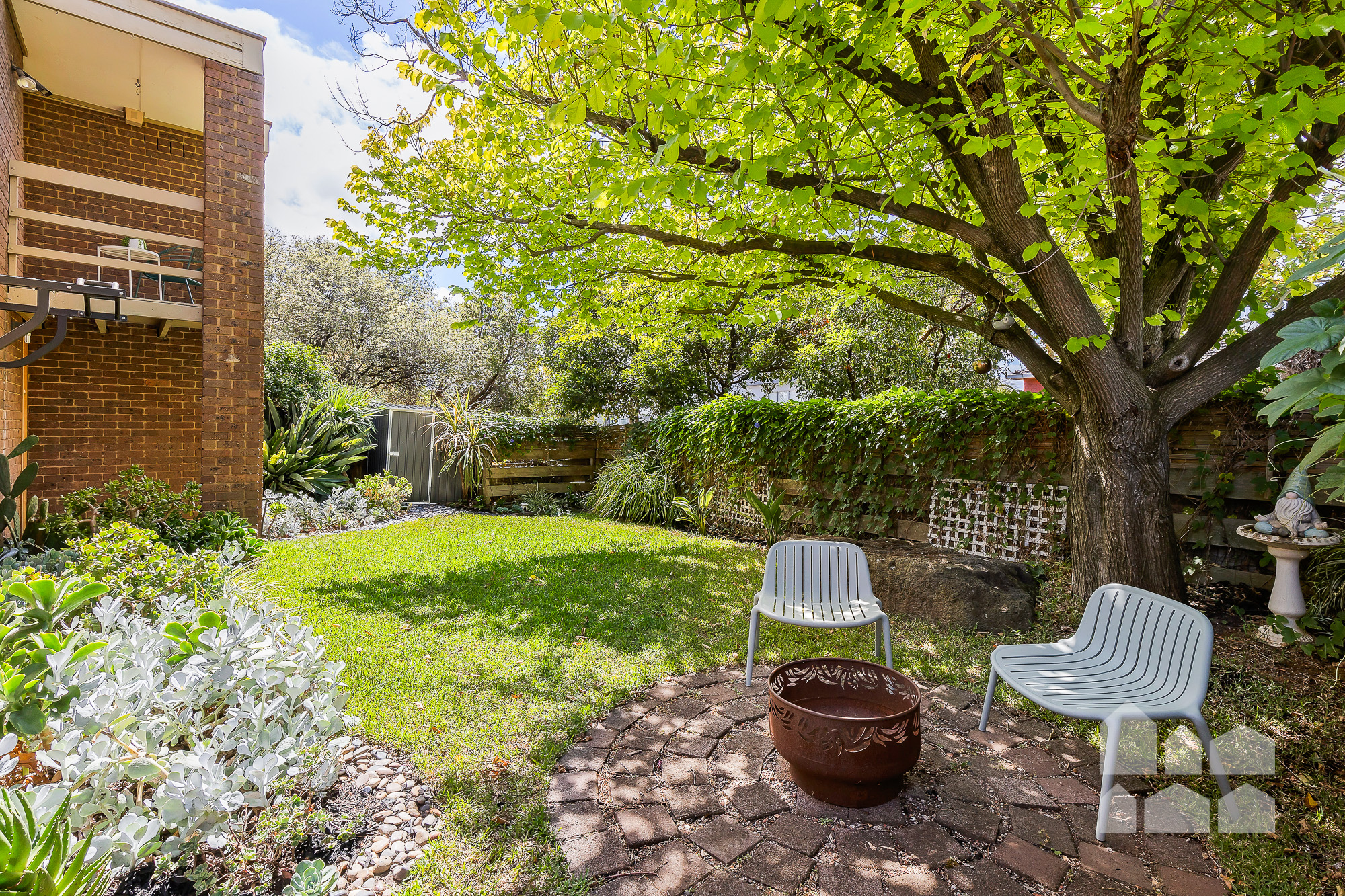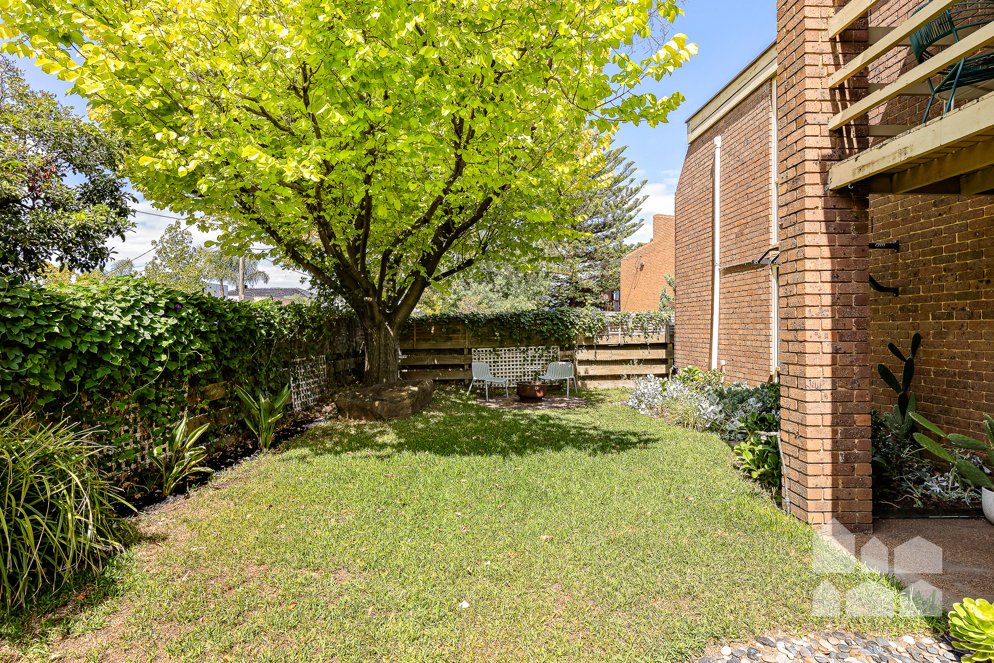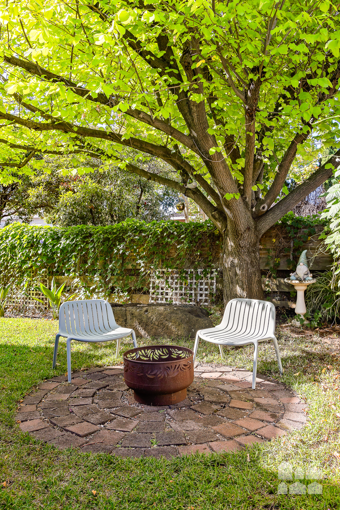 – generous backyard with entertaining patio, fire-pit zone, lush lawn and established garden beds and trees