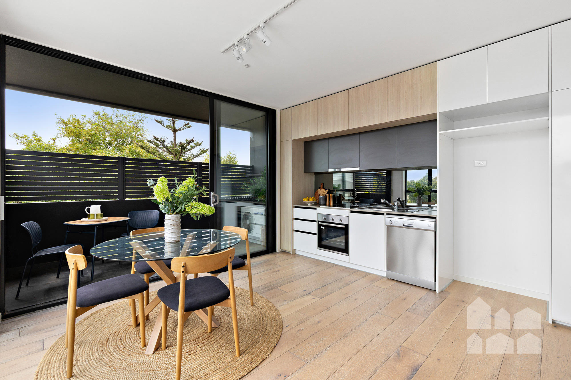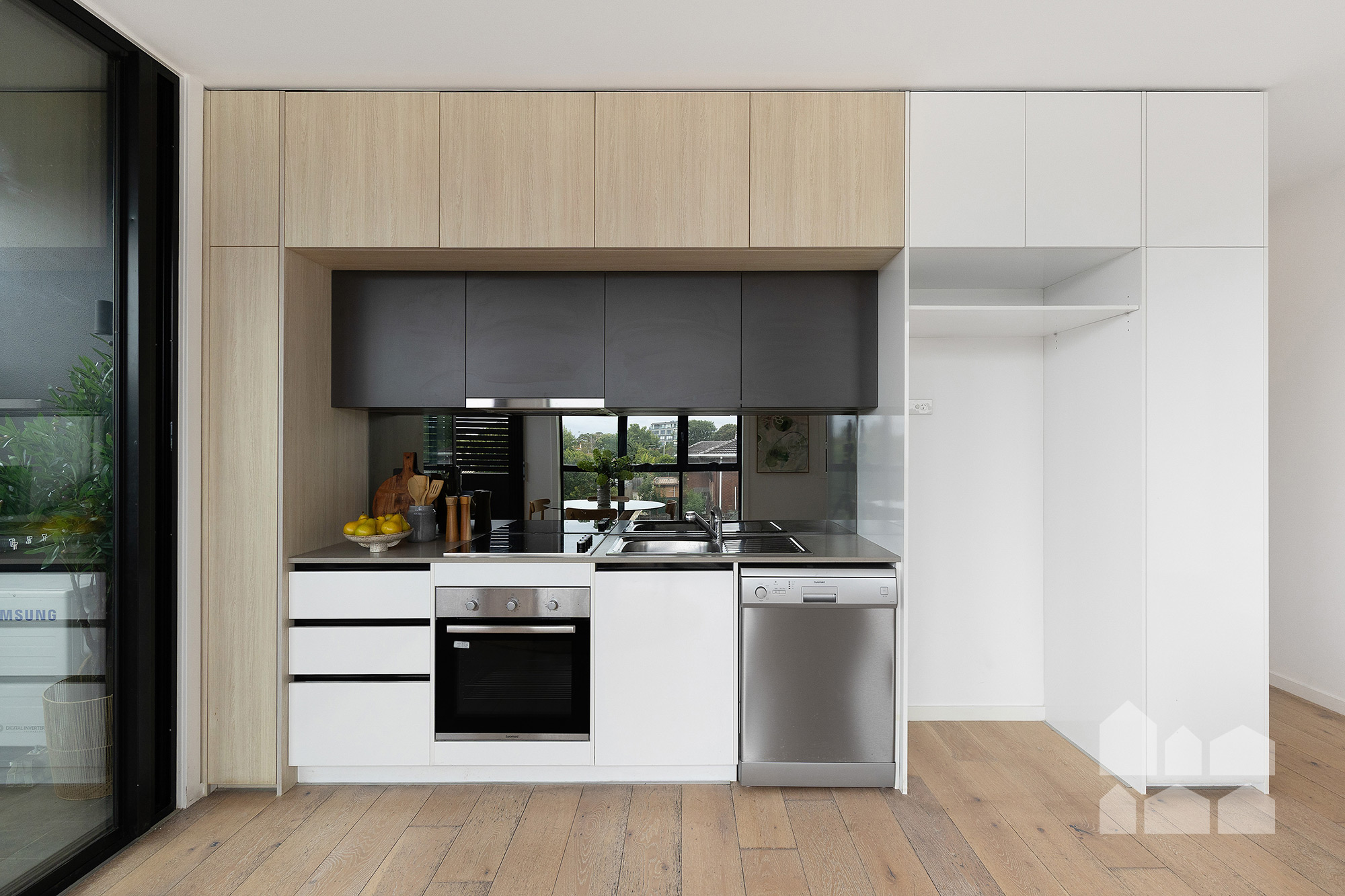 – light-filled open-plan living zone with well-appointed kitchen boasting electric cooking and stainless-steel appliances