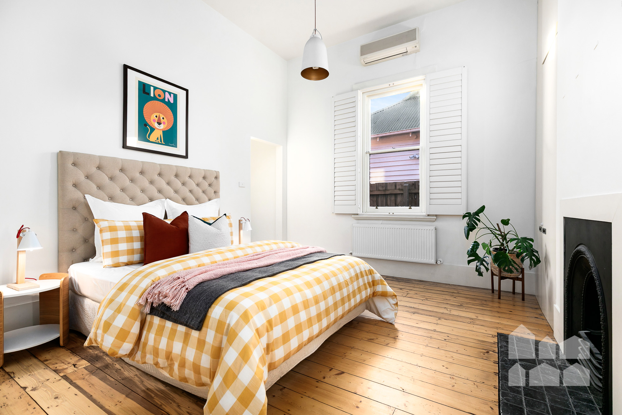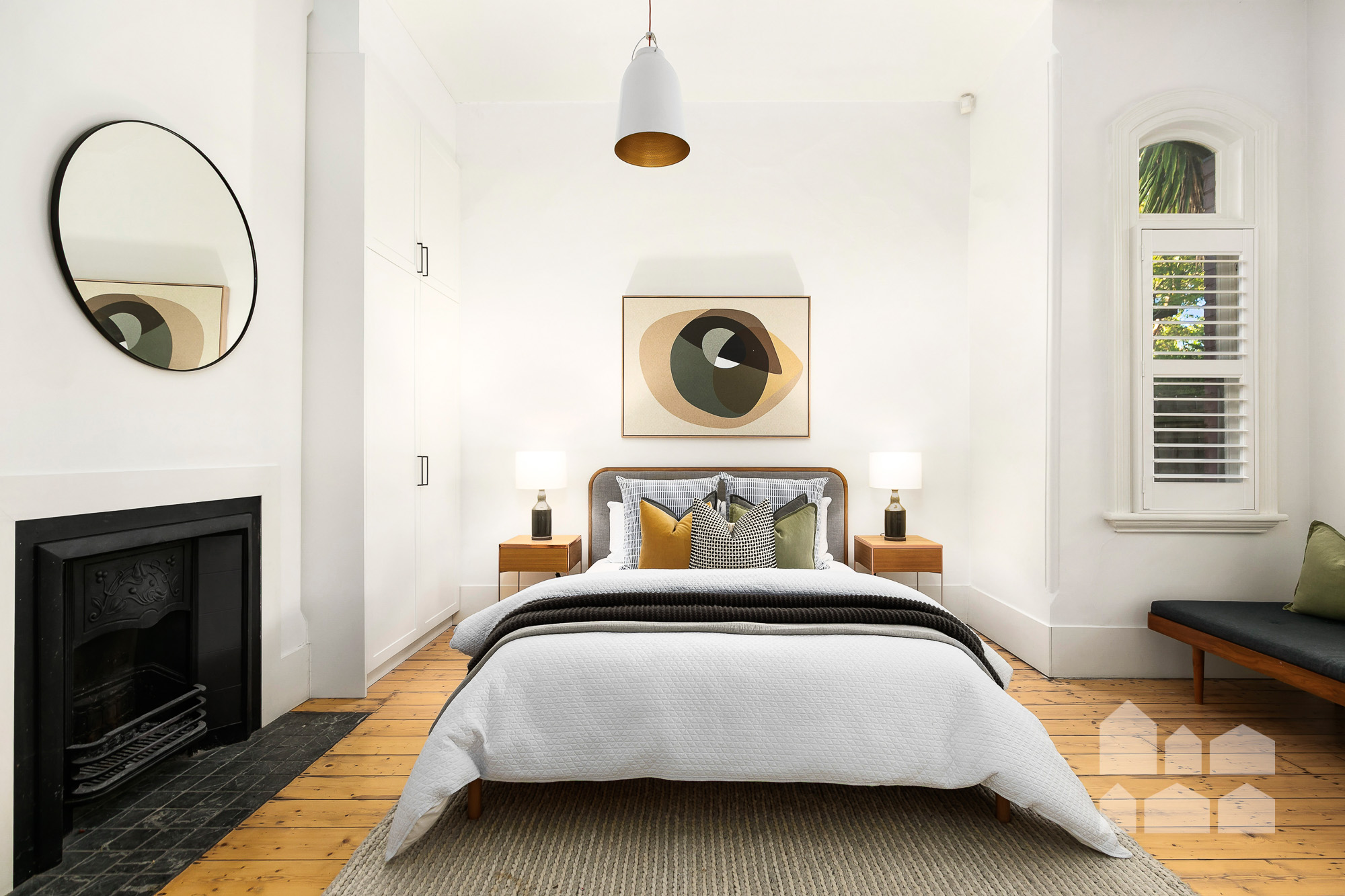 – main bedroom with heritage fireplace flanked by built-in robes