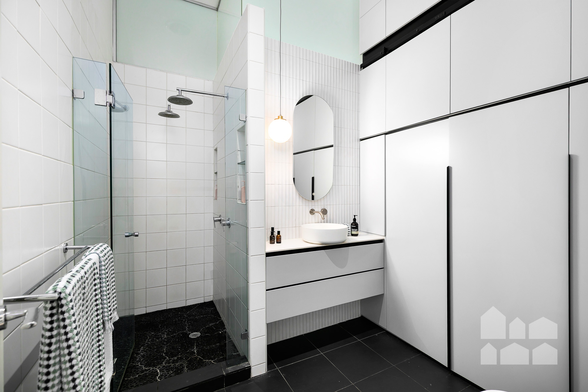 – stylish bathroom with incorporated European laundry