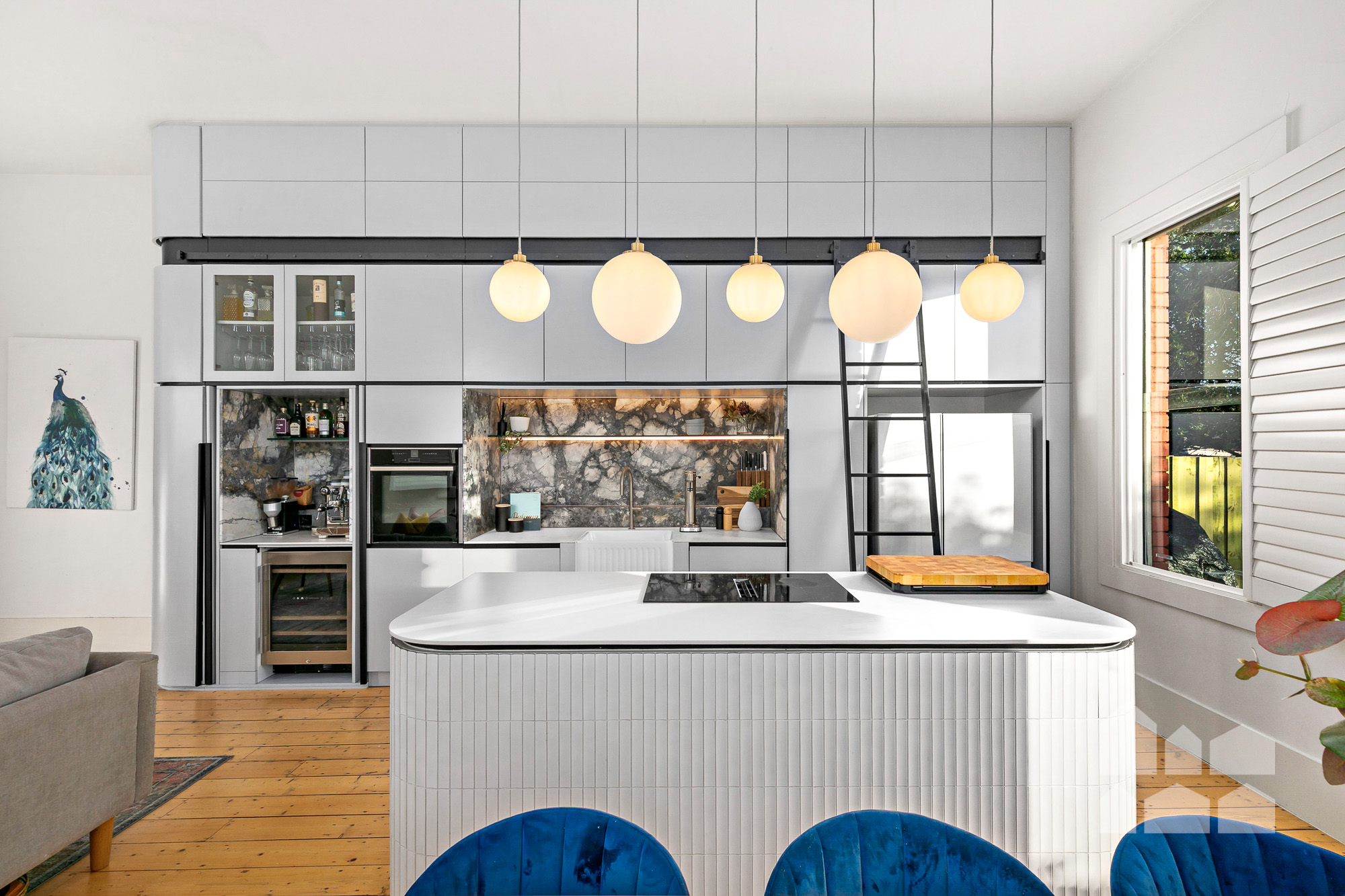 – stunning open-plan living showcasing light-filled lounge and dining zones alongside a designer kitchen, with a sleek bar area and top of the line European appliances, featuring an island bench, chic cabinetry and induction cooking