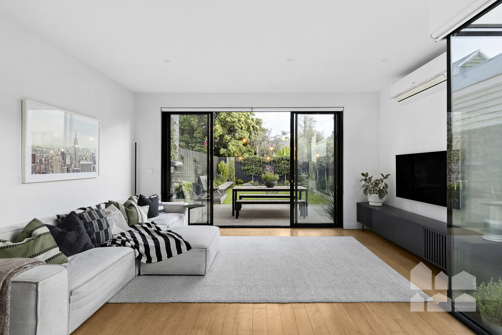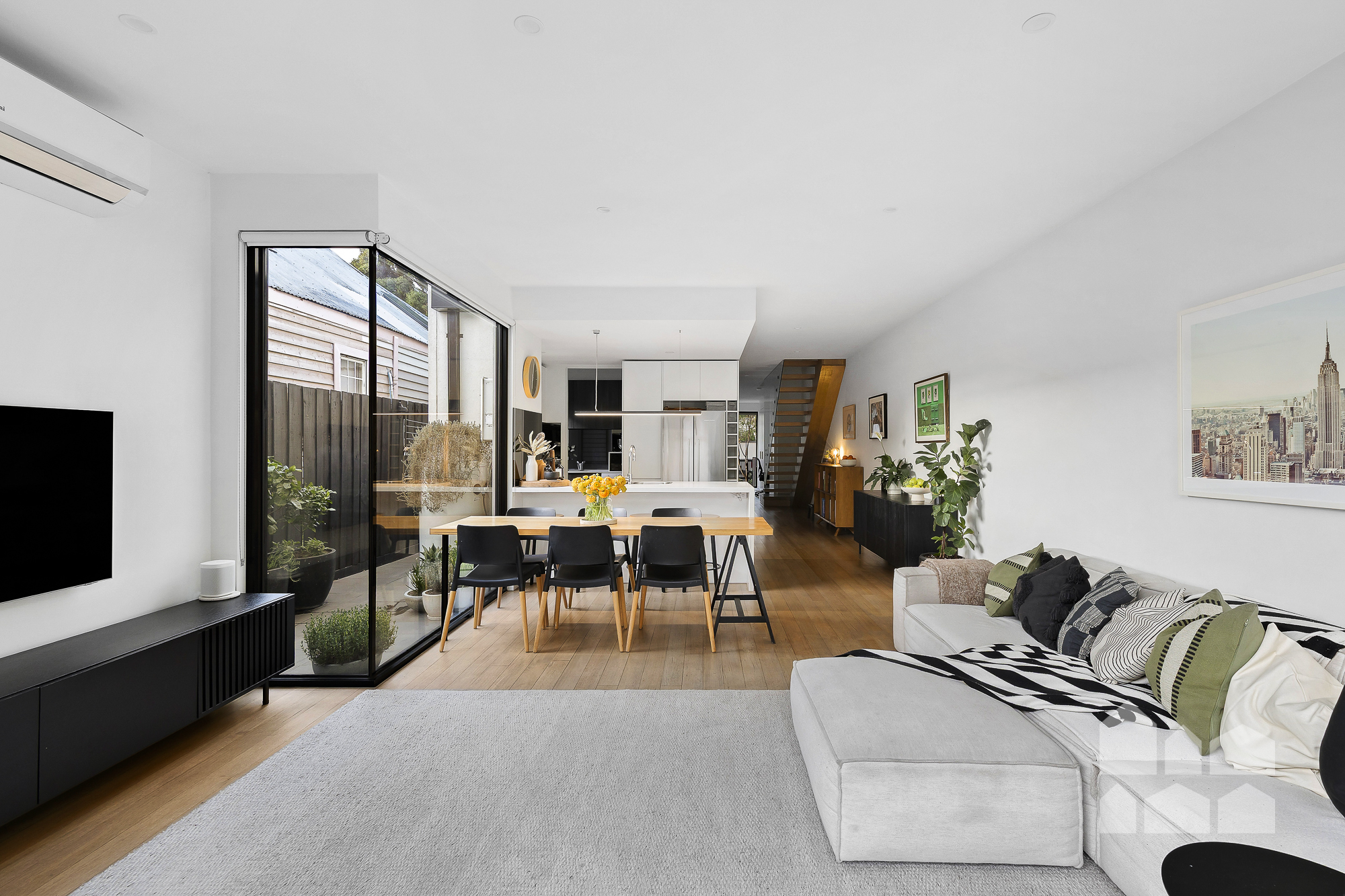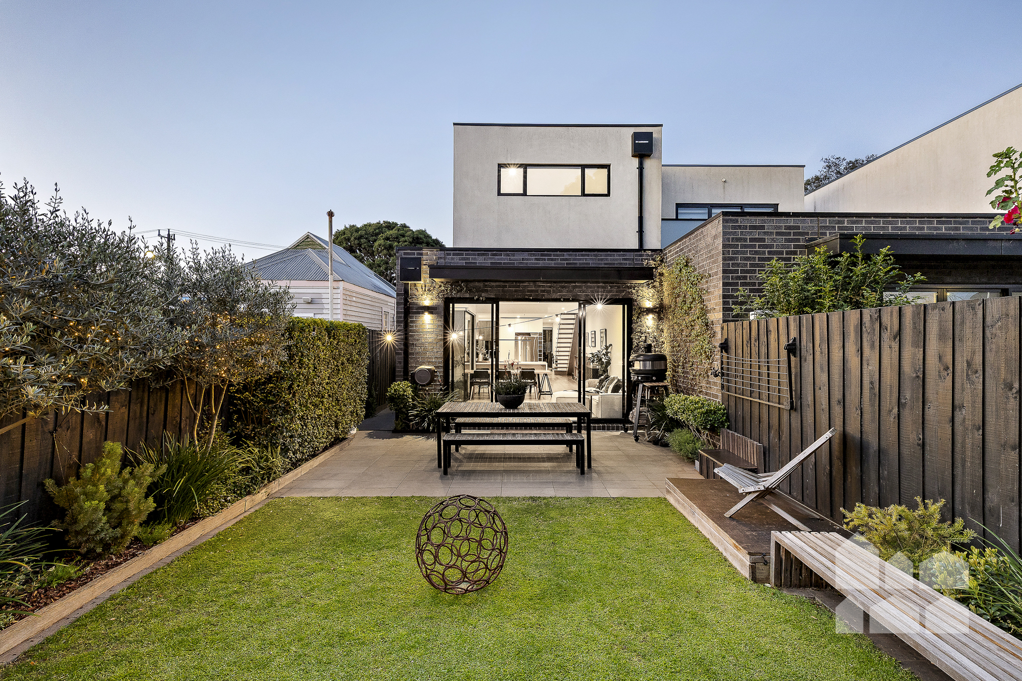 Situated in a highly coveted Yarraville location, this stunning three-bedroom, two-bathroom home offers sleek, modern interiors over two spacious levels and a generous entertainer’s backyard. A stylish sitting room is warmed by a gas log fireplace and provides a cosy complement to the sun-drenched open-plan living space, where you’ll enjoy side courtyard and garden views, with direct access to the paved patio ensuring easy alfresco dining and an effortless indoor/outdoor flow. Park off-street with ease and enjoy walk-to-everything convenience, with the village, schools and Cruickshank Park all within strolling distance of home.