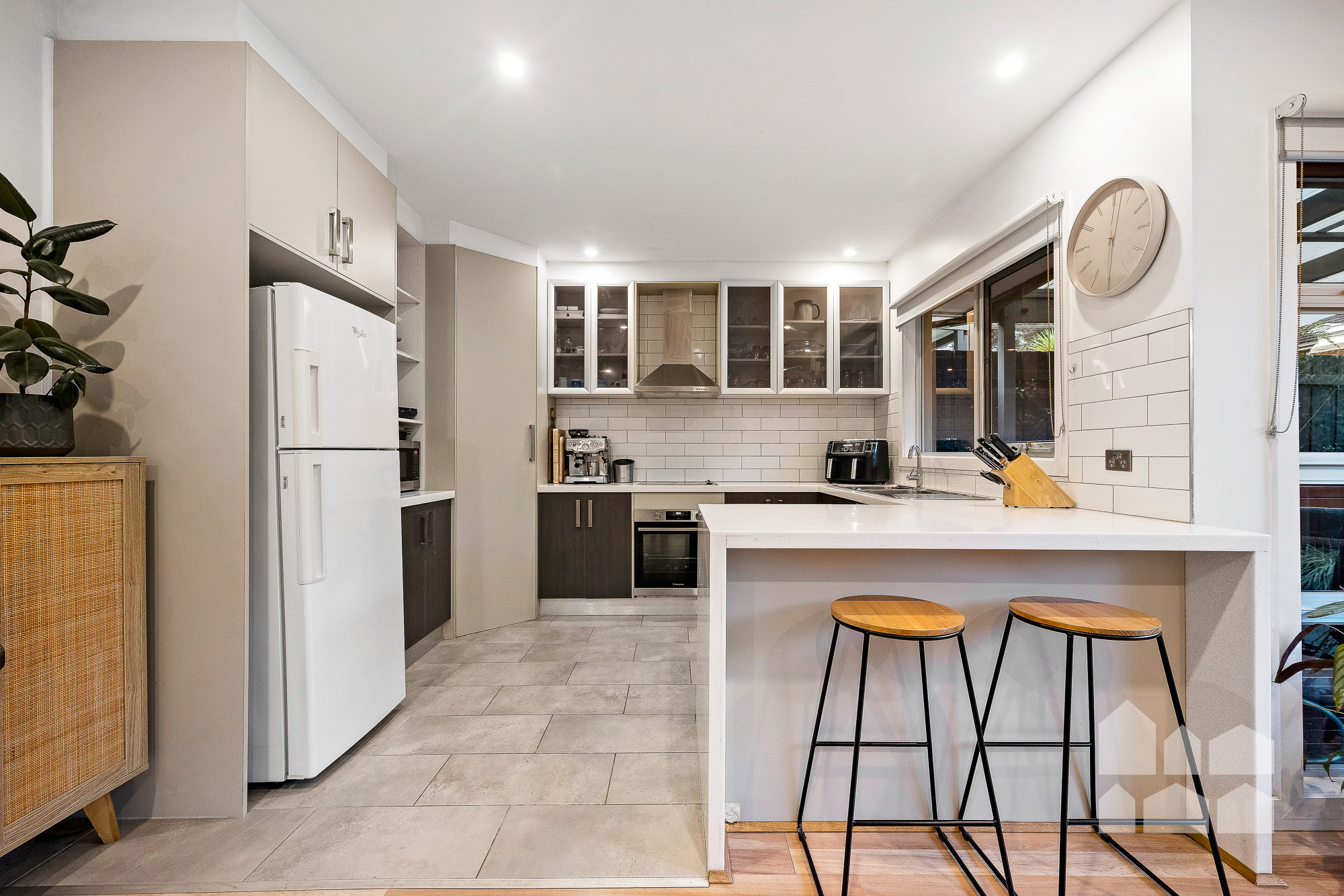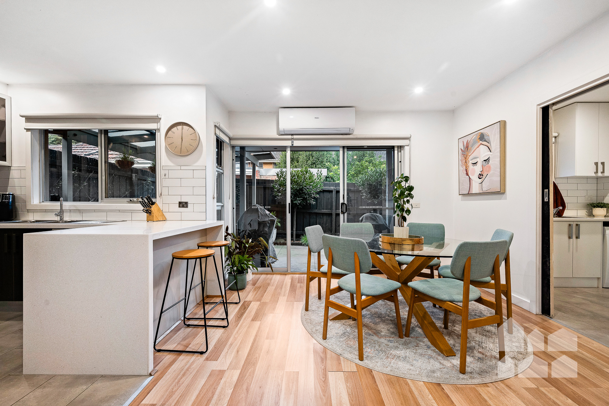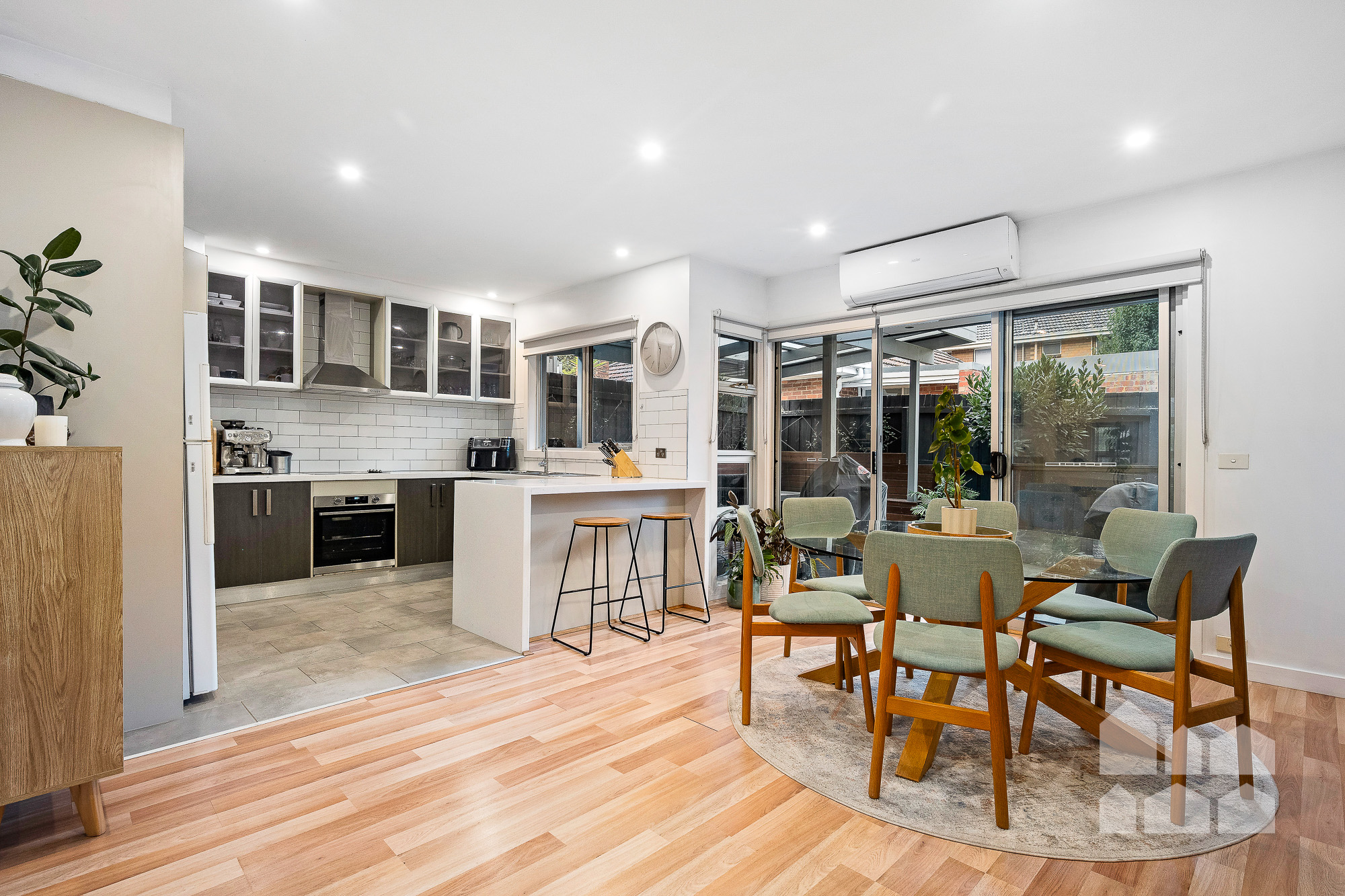 – open-plan kitchen/dining featuring a stylish subway-tiled kitchen with stone benchtops and a breakfast bar