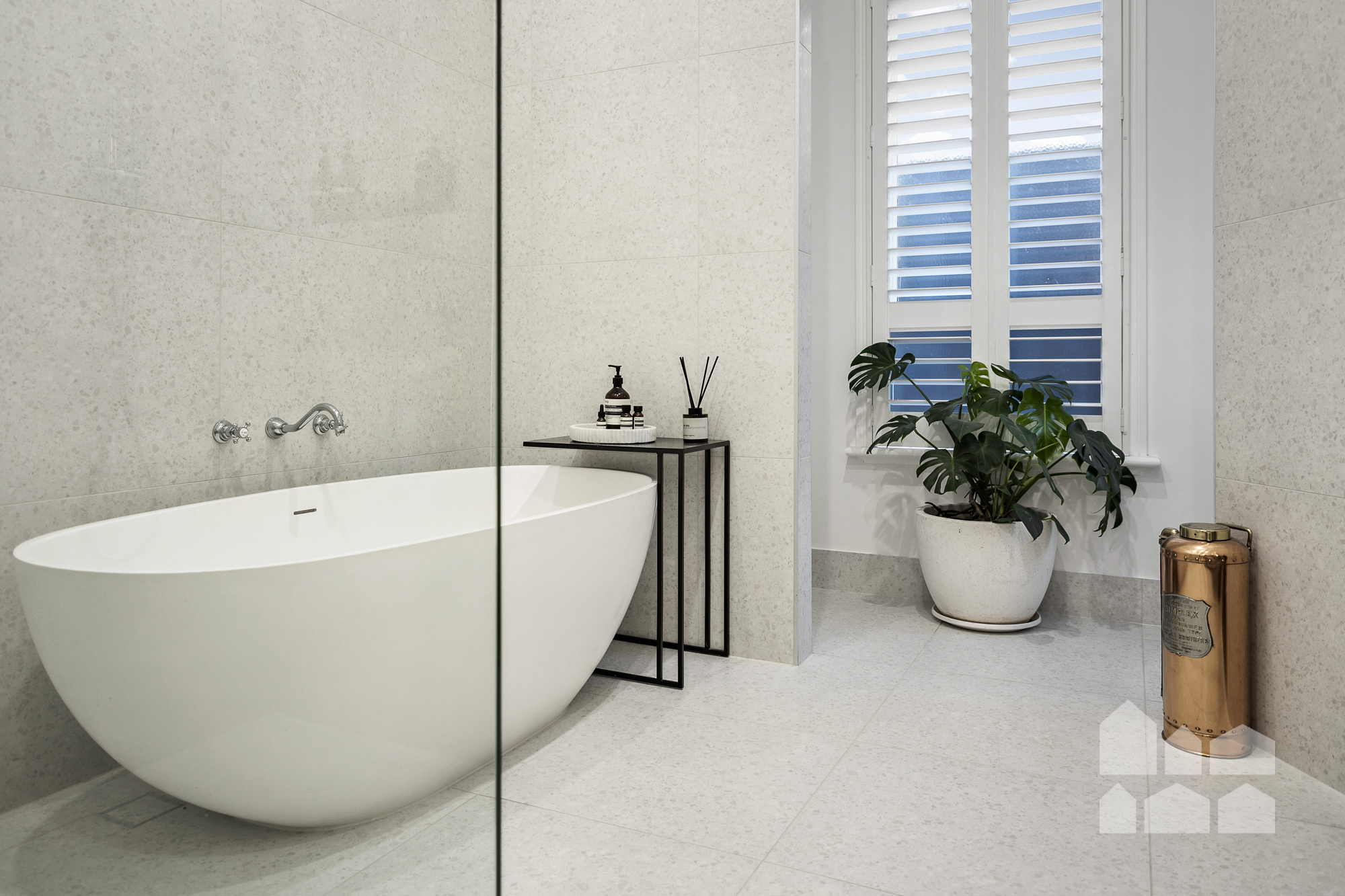 -beautifully styled and luxuriously spacious bathroom with a freestanding bath, rainfall shower, a stunning stone-topped timber vanity, underfloor heating and fireplace