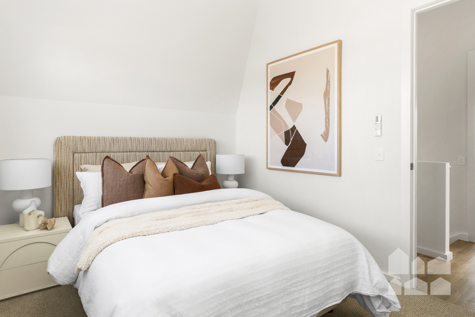 Upstairs offers two spacious bedrooms featuring a generous built-in robe to one room and walk in robe to other. Serviced by a sleek central bathroom with designer fittings along with ensuite to main bedroom.