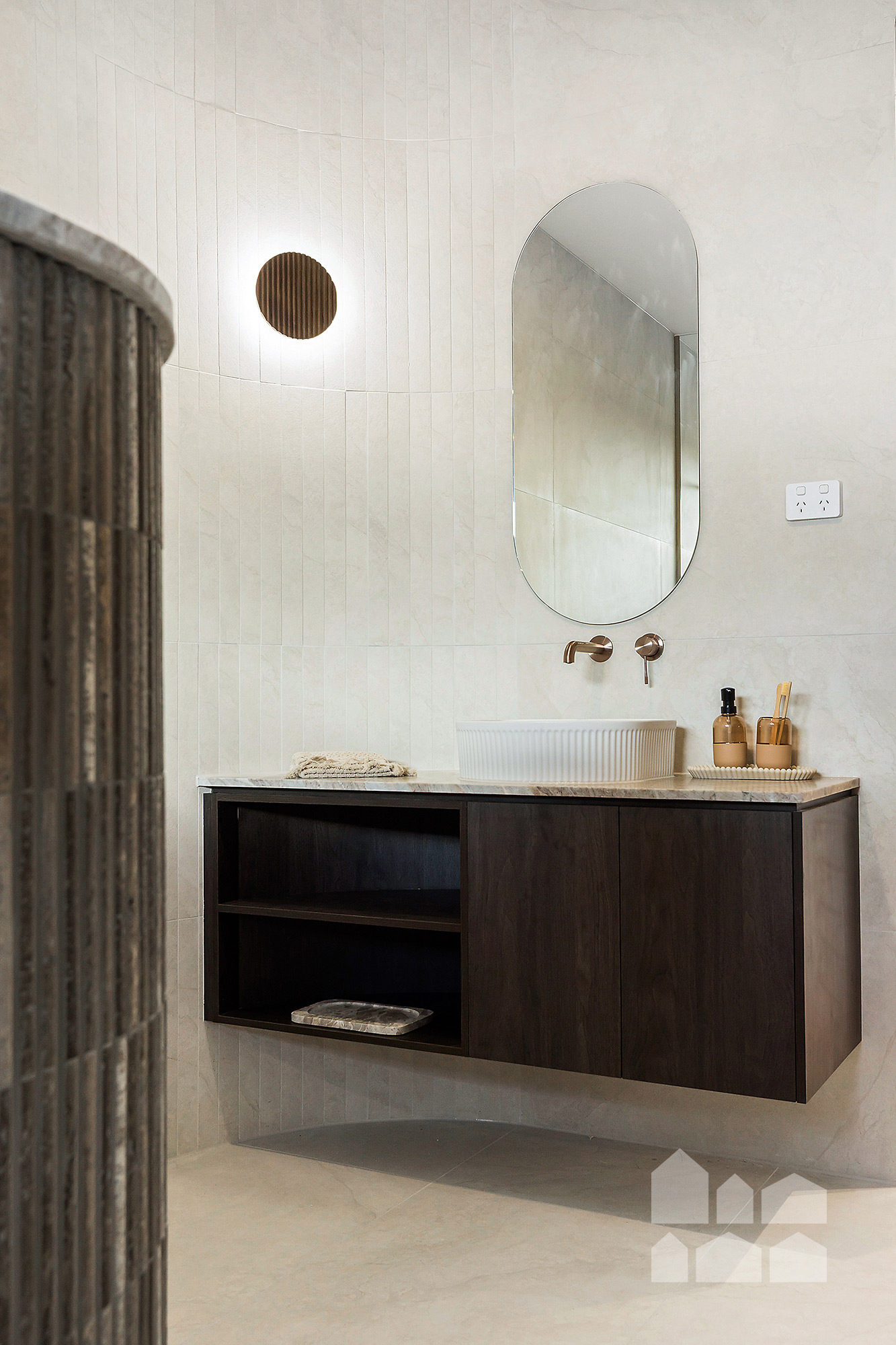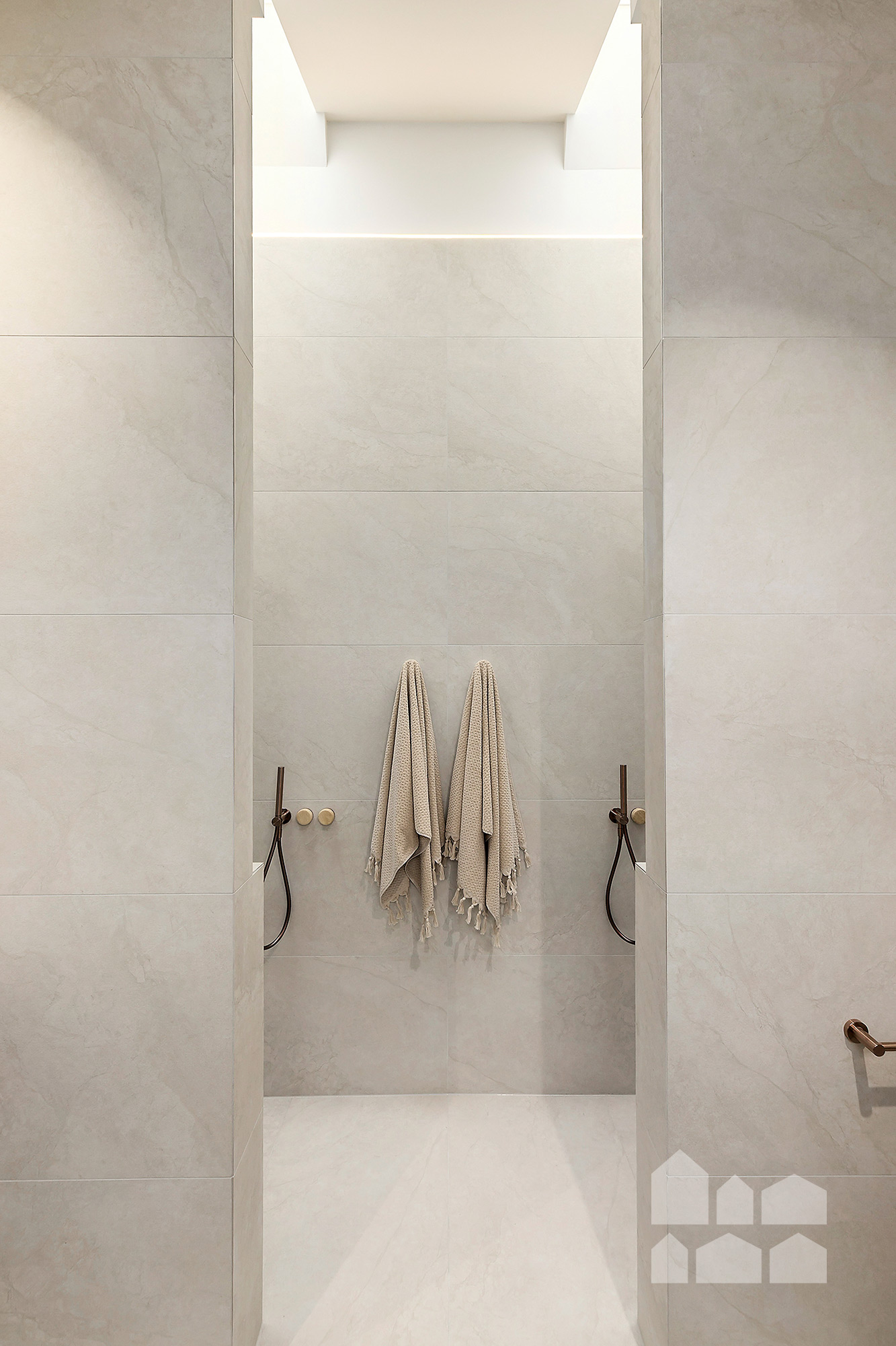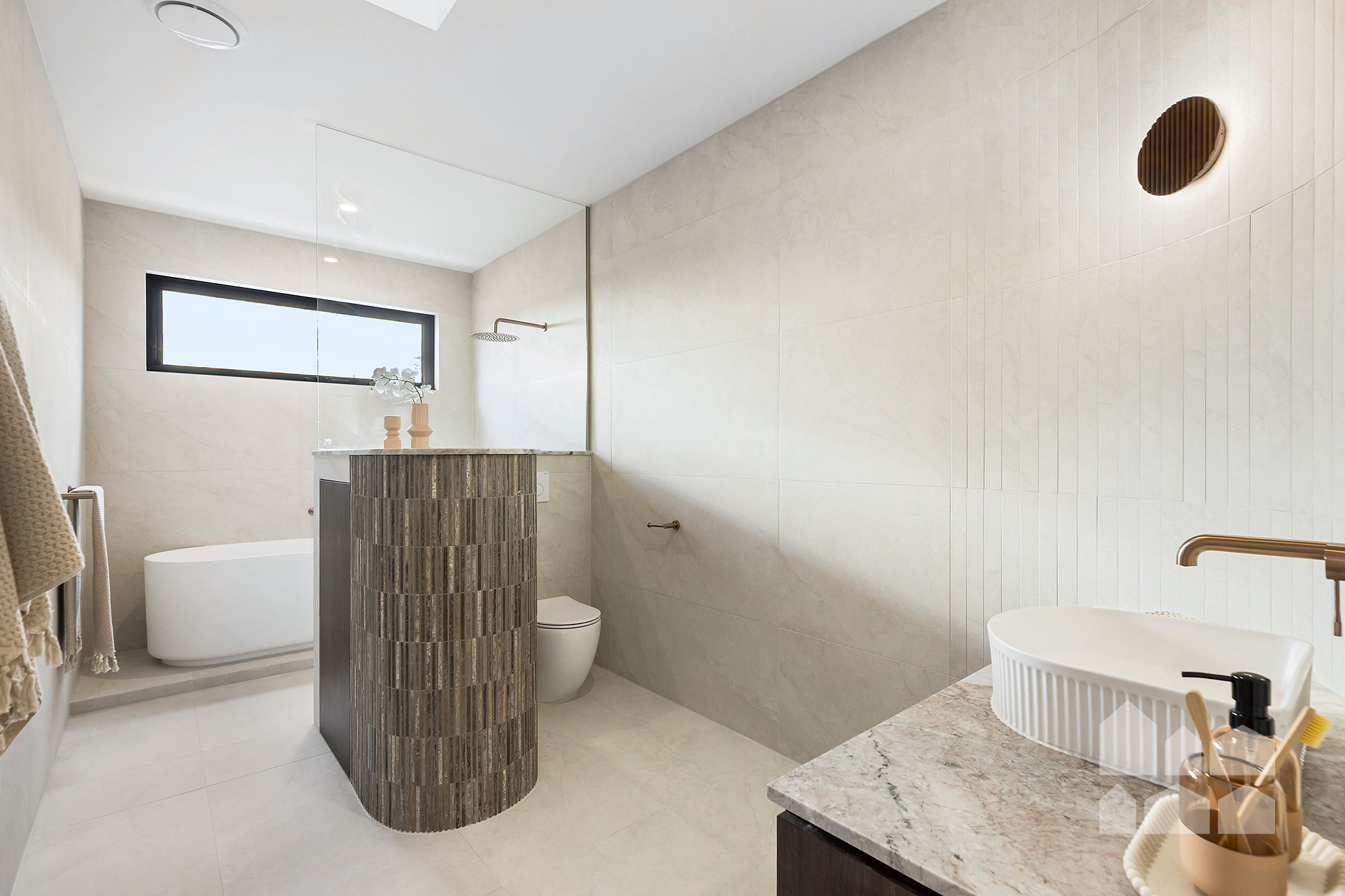 -super-luxe main bathroom with bathtub and walk-in rainfall shower + stunning finishes, including natural marble and Nero brushed bronze tapware