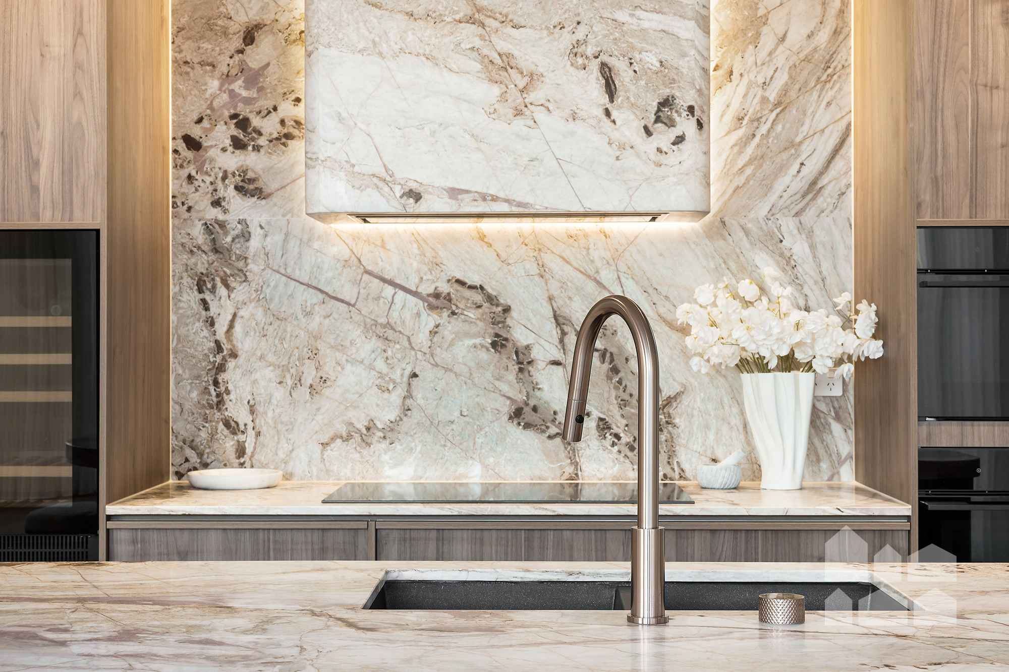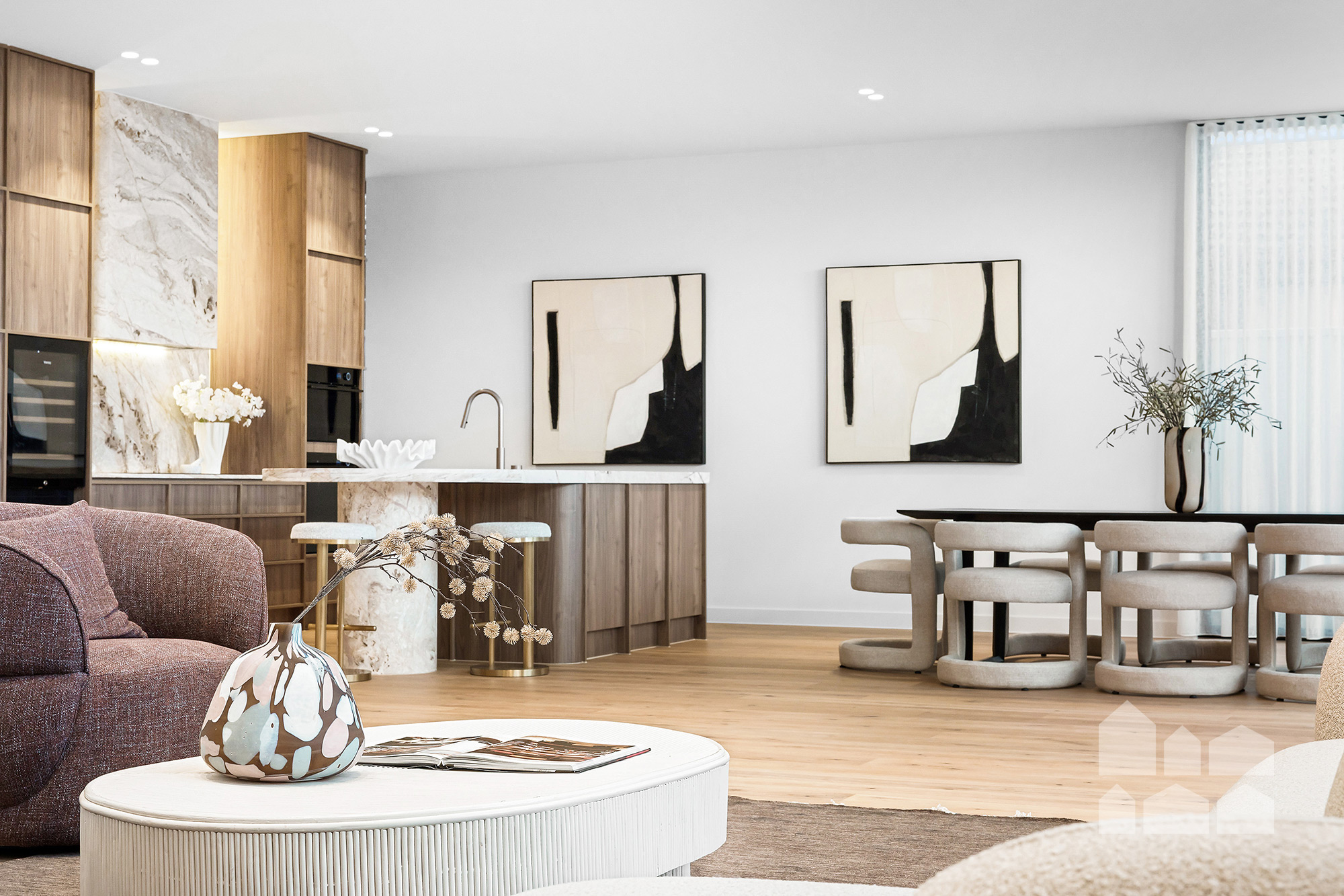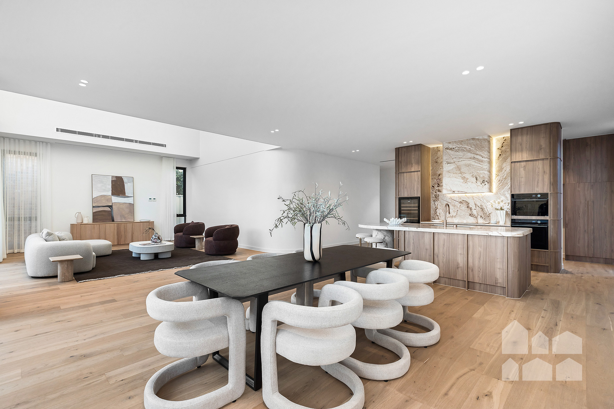 -breathtaking open-plan living – spectacular feature ceiling + large dining and living zones + designer kitchen with butler’s pantry, marble benchtops, Vintec 60-bottle wine fridge, and high-end Bosch and Fisher & Paykel appliances