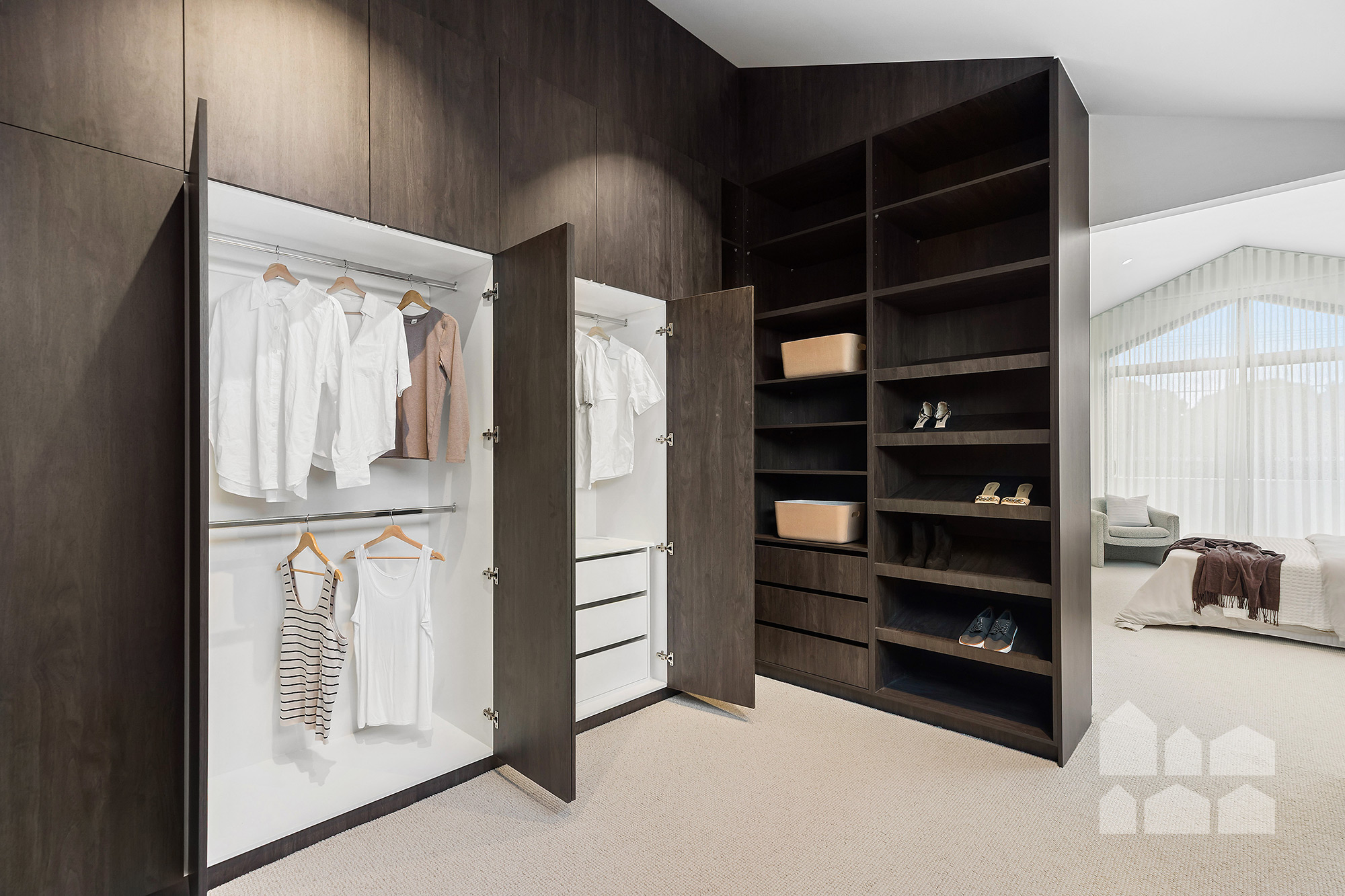 -dream main suite showcasing a spacious bedroom with a private north-facing balcony, huge walk-in robe/dressing room with excellent storage, and a spacious marble ensuite with twin showers and double vanity