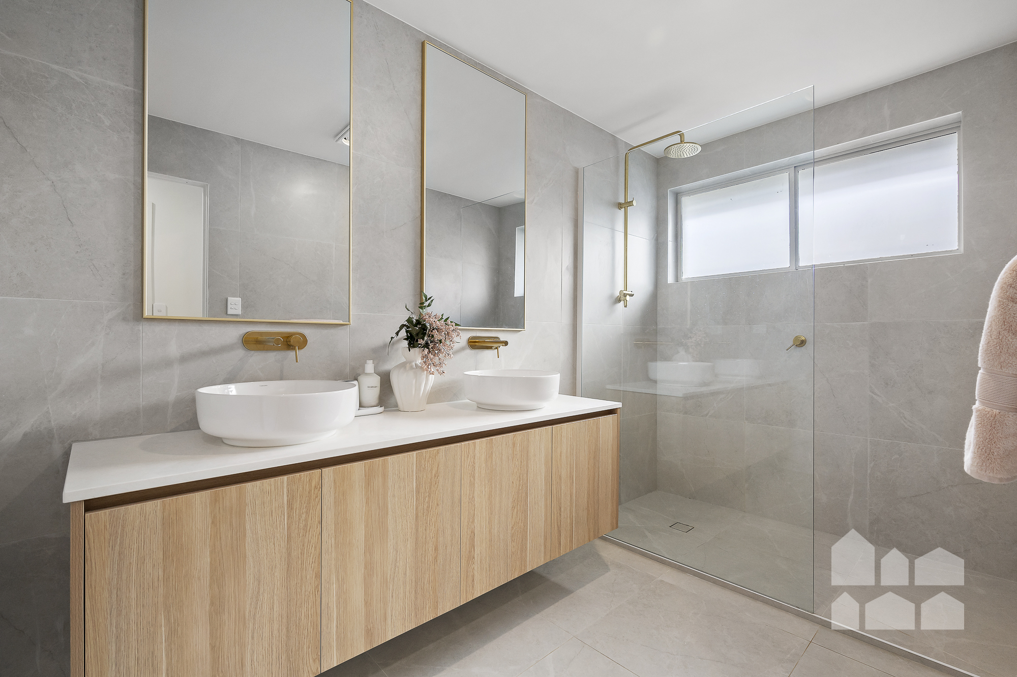 – luxe bathroom with floor-to-ceiling tiling, a walk-in rainfall shower and double vanity + separate toilet