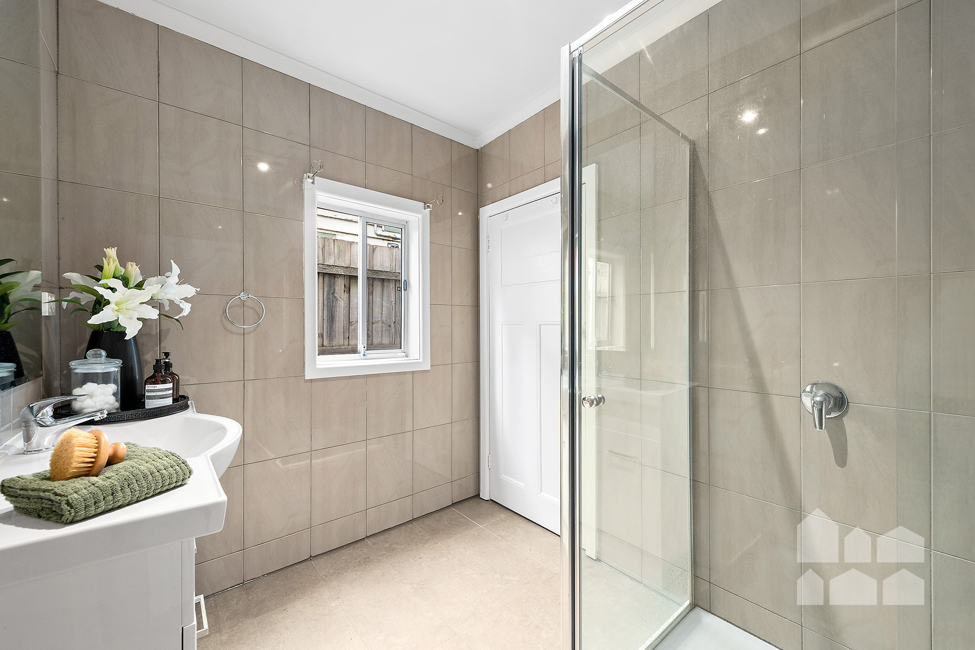 – stylish bathroom with floor-to-ceiling tiles