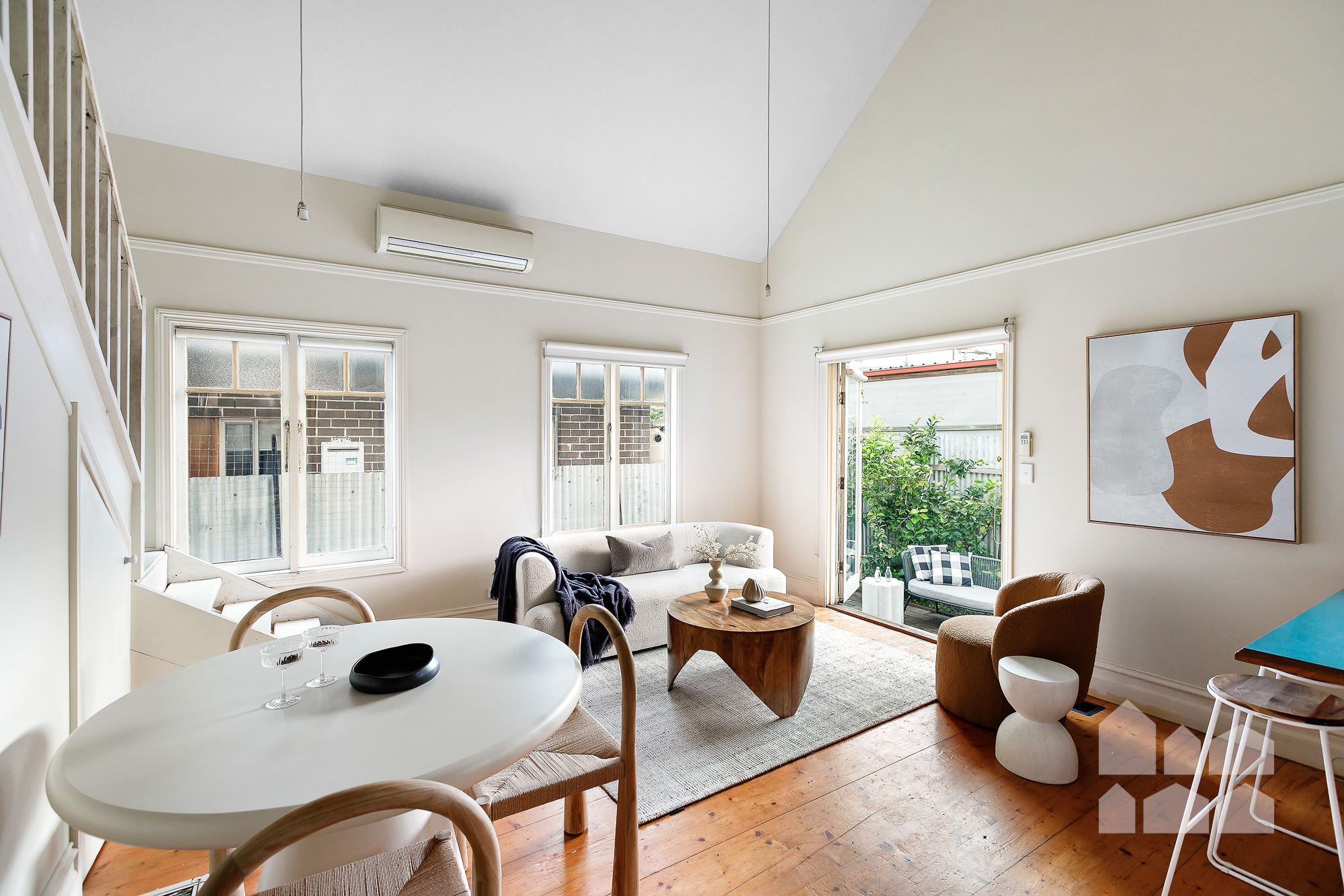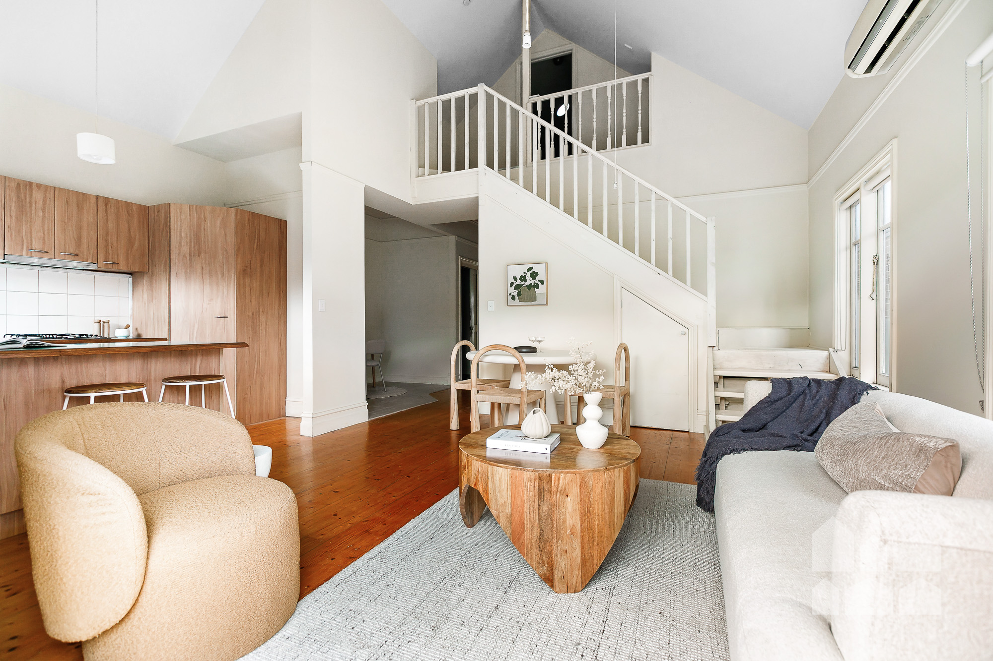 – sunny open-plan living crowned by a soaring cathedral ceiling, showcasing a generous lounge/dining zone and a well-appointed kitchen with breakfast bar