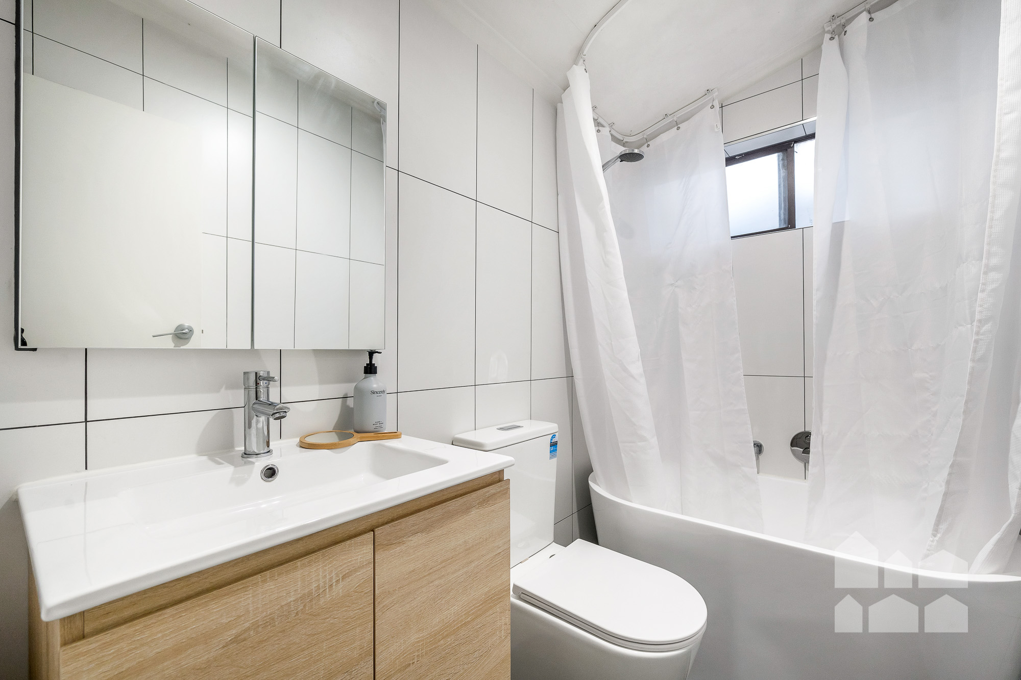 – modern bathroom with floor-to-ceiling tiling and an inviting bathtub with overhead shower + handy second toilet