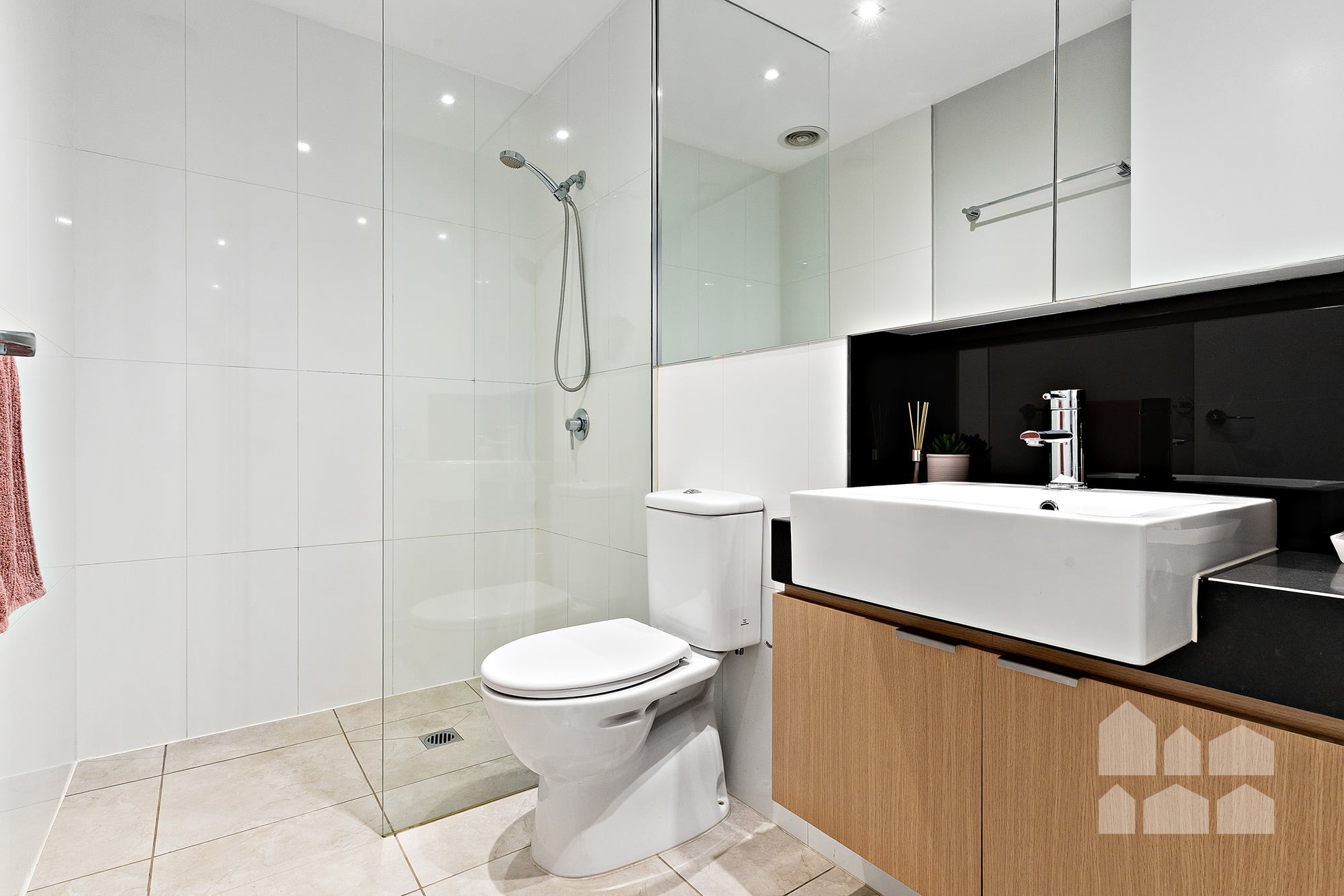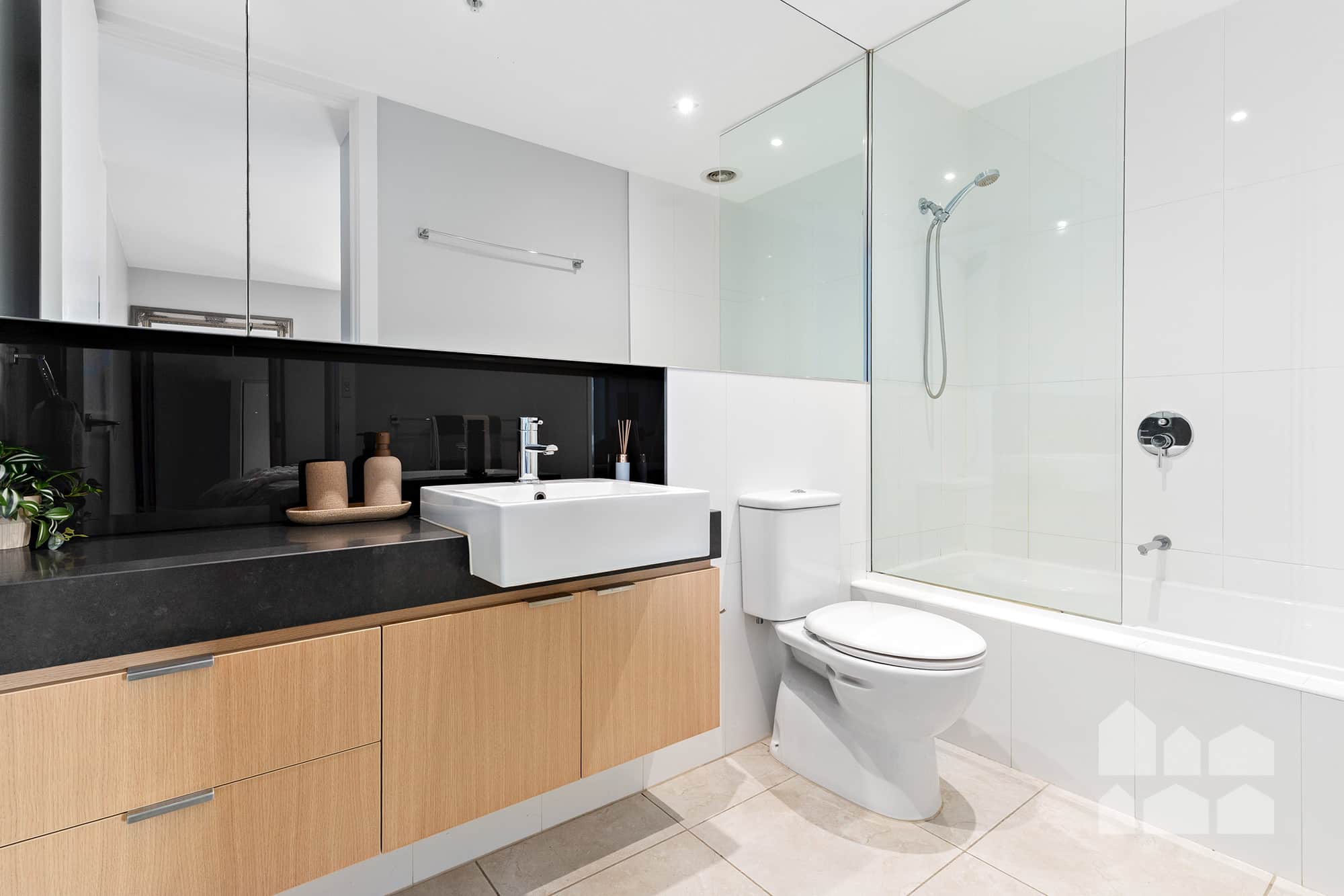 – two bedrooms with built-in robes, including main with door to balcony and ensuite with a bath with overhead shower