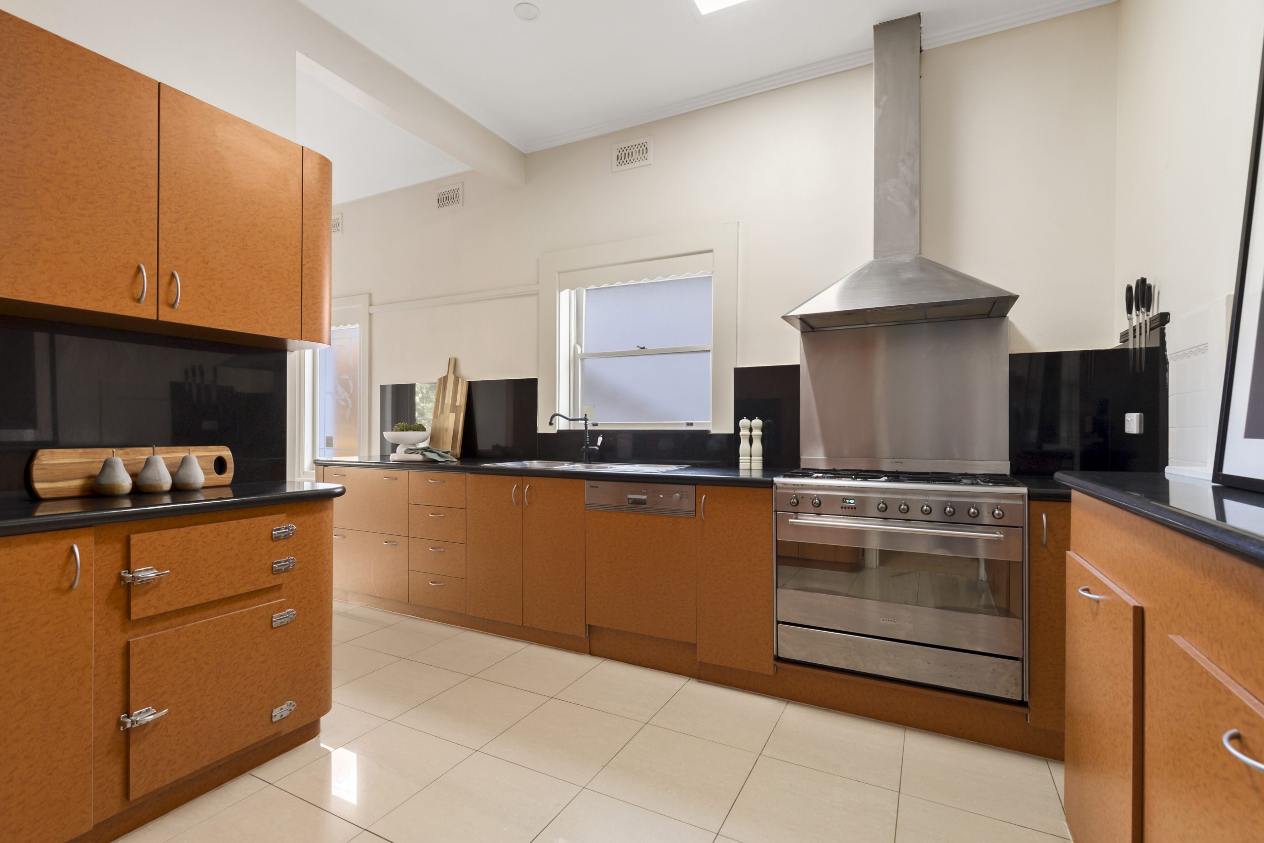 – granite-bench kitchen with 900mm Smeg oven and integrated Miele dishwasher