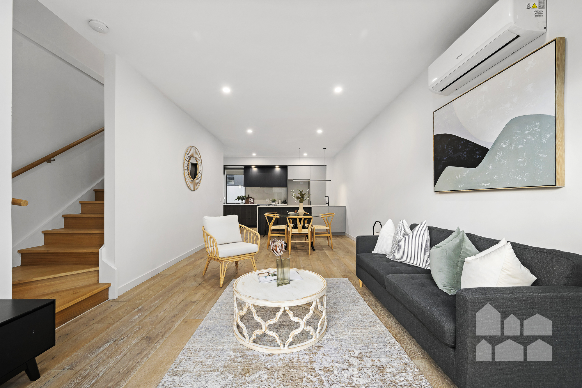 • first floor open-plan living features engineered timber floors + spacious living/dining zone opening to a private balcony + reverse-cycle split system + study nook potential