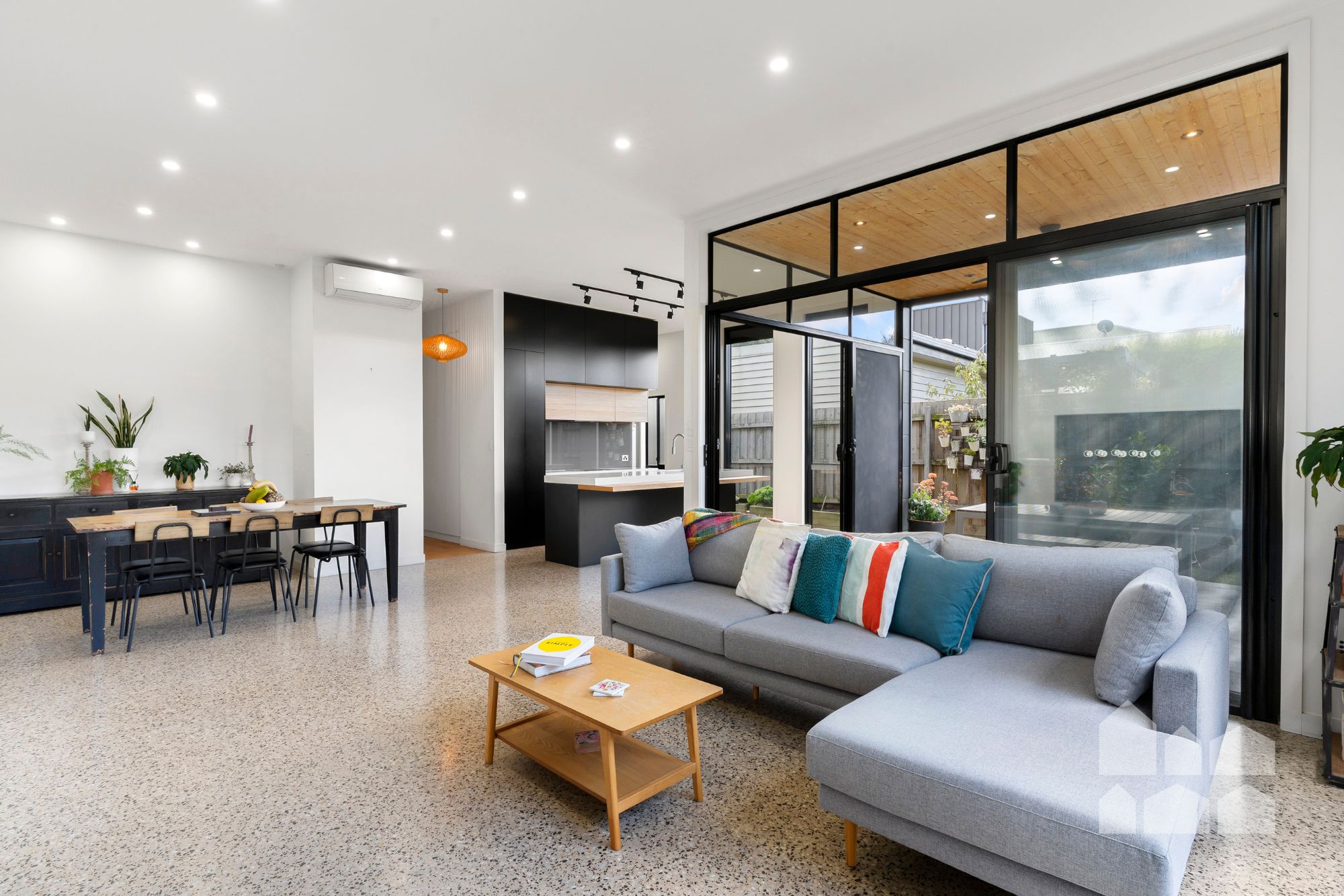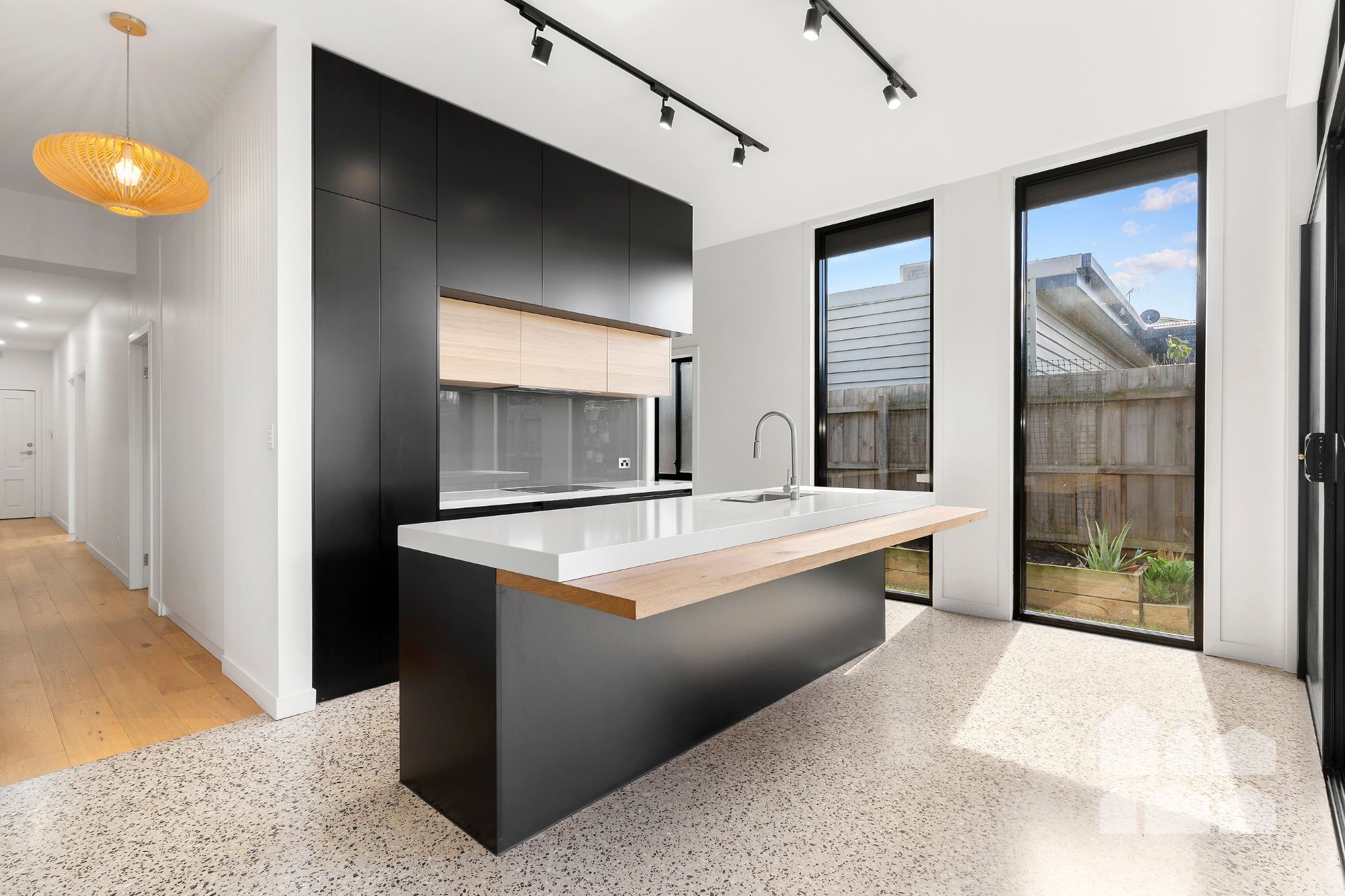 Behind its timeless weatherboard façade lies a light-filled sanctuary boasting a flexible open-plan layout, high ceilings and polished concrete floors. The heart of the home is the generous kitchen – stone benchtops, a large island, and a walk-in butler’s pantry set the tone for seamless entertaining.