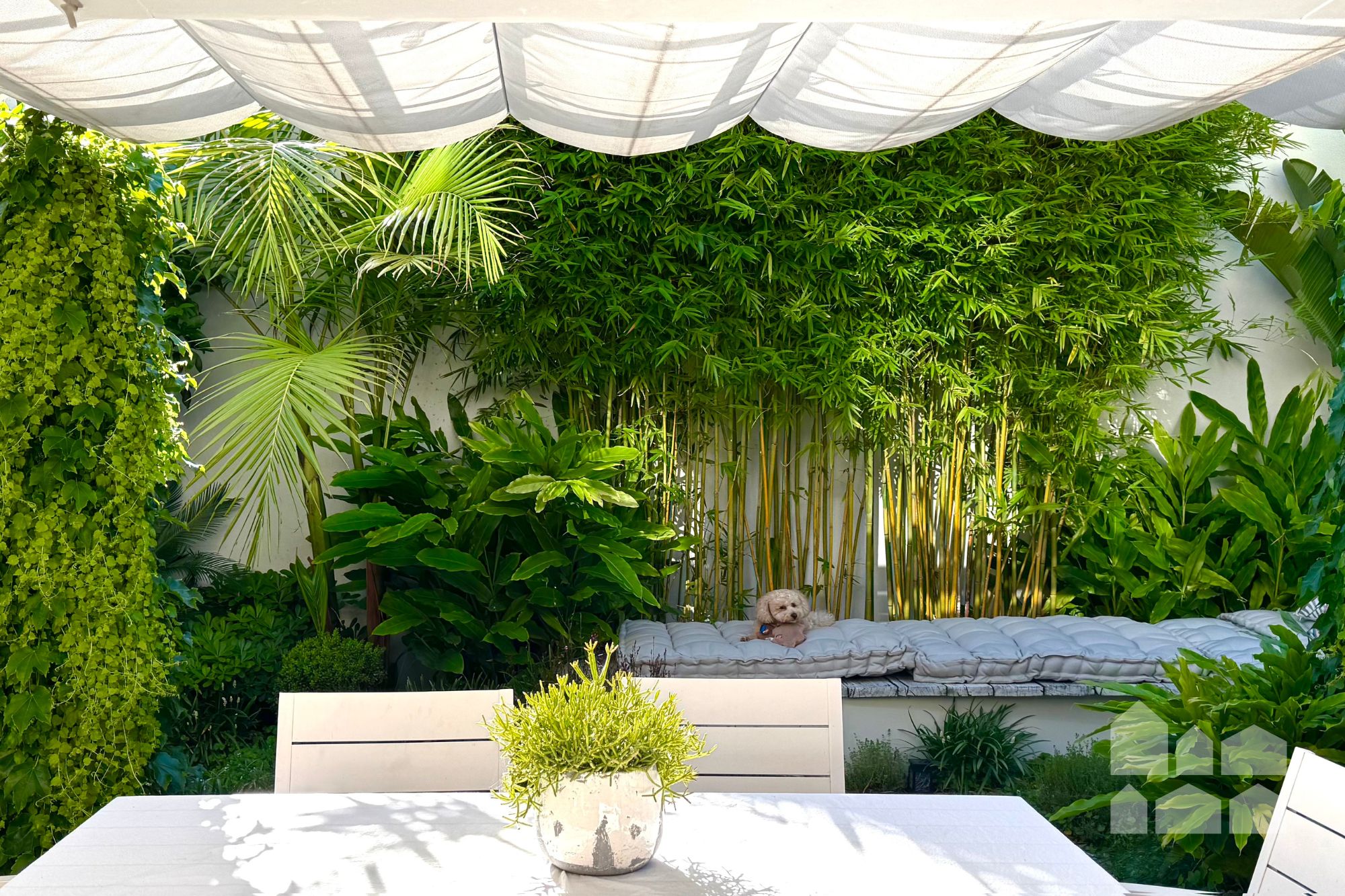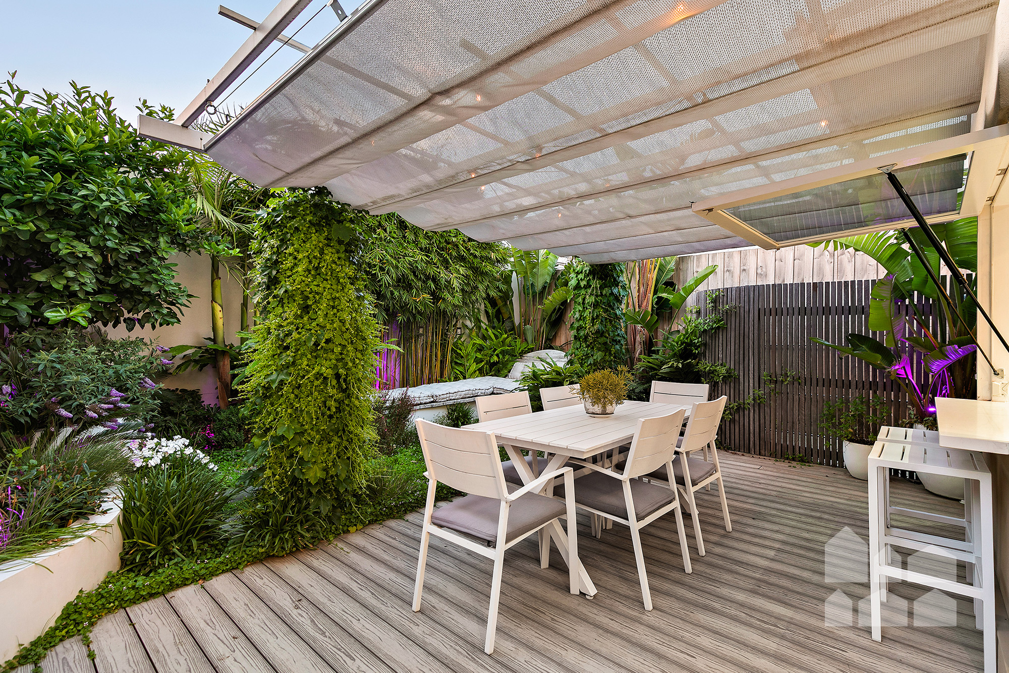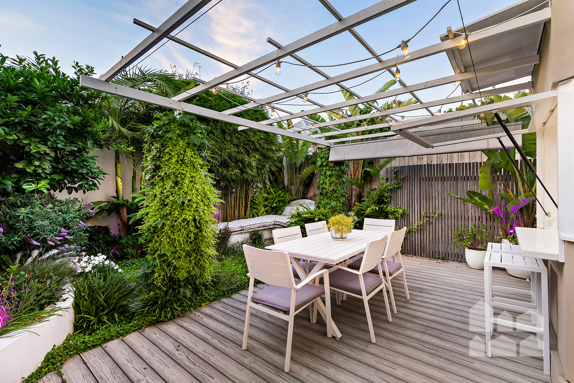 The garden also incorporates a cleverly concealed utility zone screened by curved merbau timber slats, complete with washing line, storage, small shed, and external power.