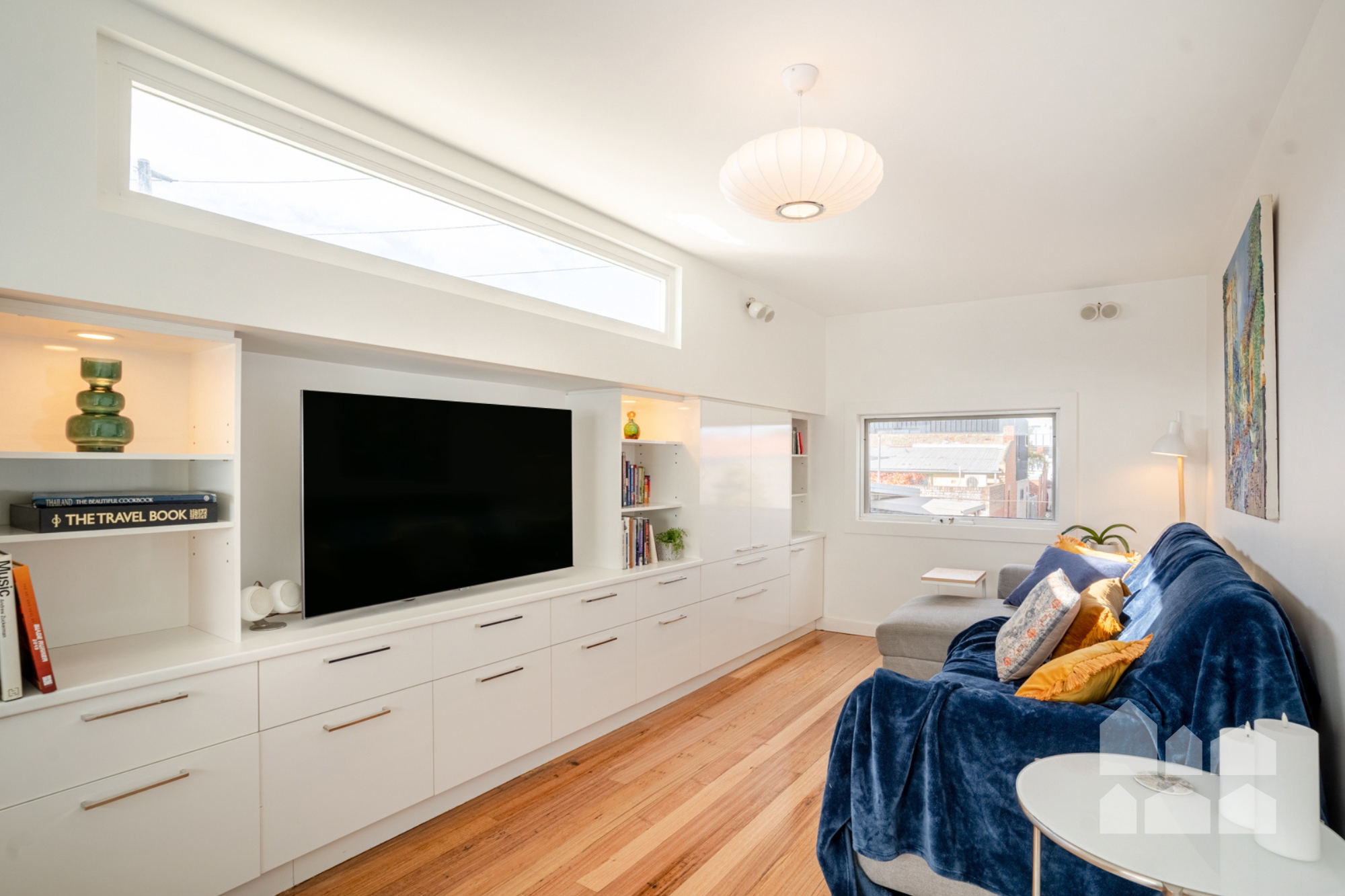 Upstairs, the expansive master bedroom enjoys sweeping city skyline views from its private balcony – perfect for champagne on New Year’s Eve or relaxed morning coffee and breakfast. Three additional bedrooms are also located on this level, alongside a stylish central bathroom featuring a stone-top vanity and luxurious deep bathtub. One bedroom is currently configured as a media room or home office with generous built-in storage.