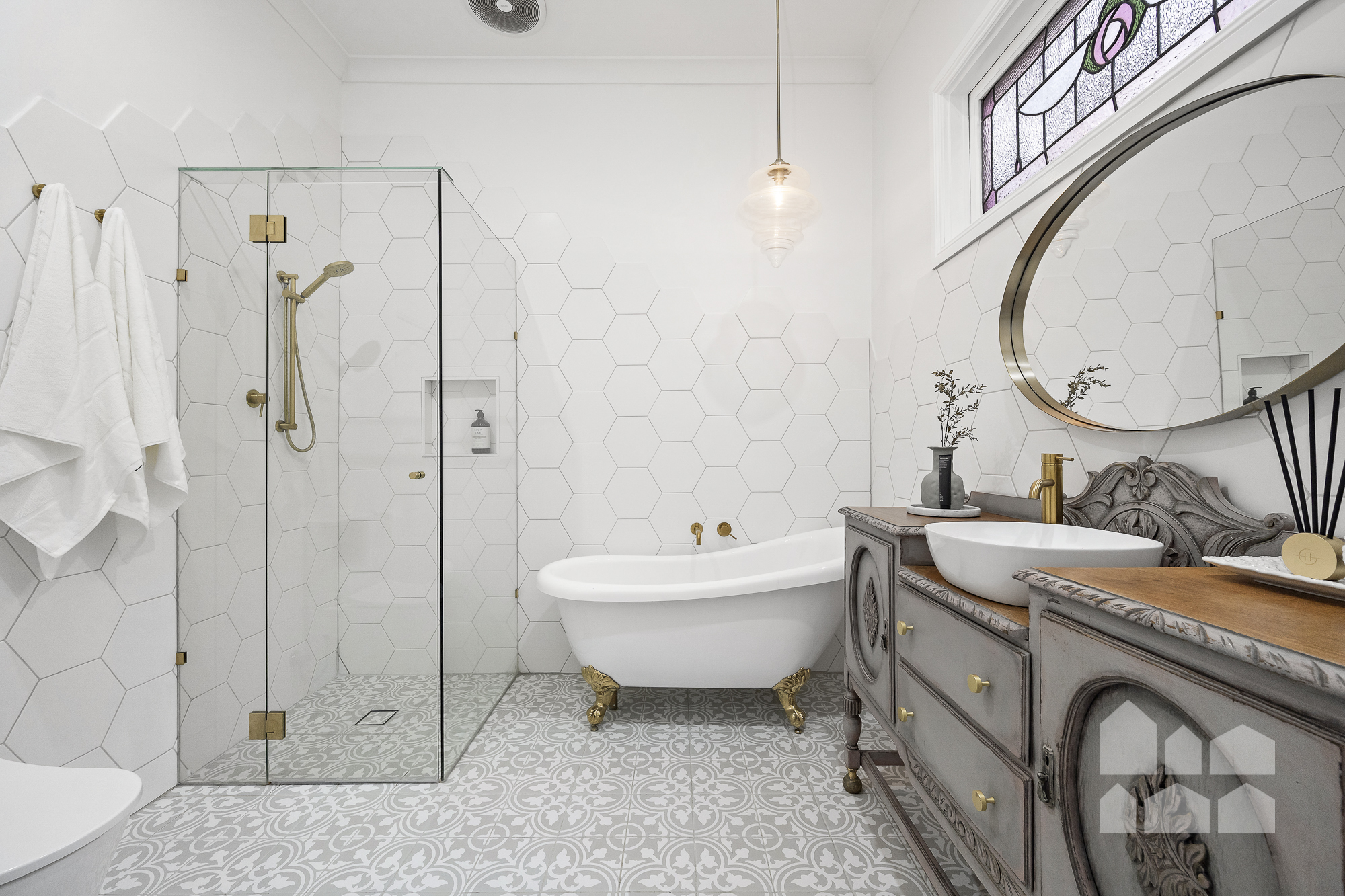 – Luxe bathroom with clawfoot bath, shower, feature vanity, brushed brass tapware and an incorporated European laundry for ultimate convenience