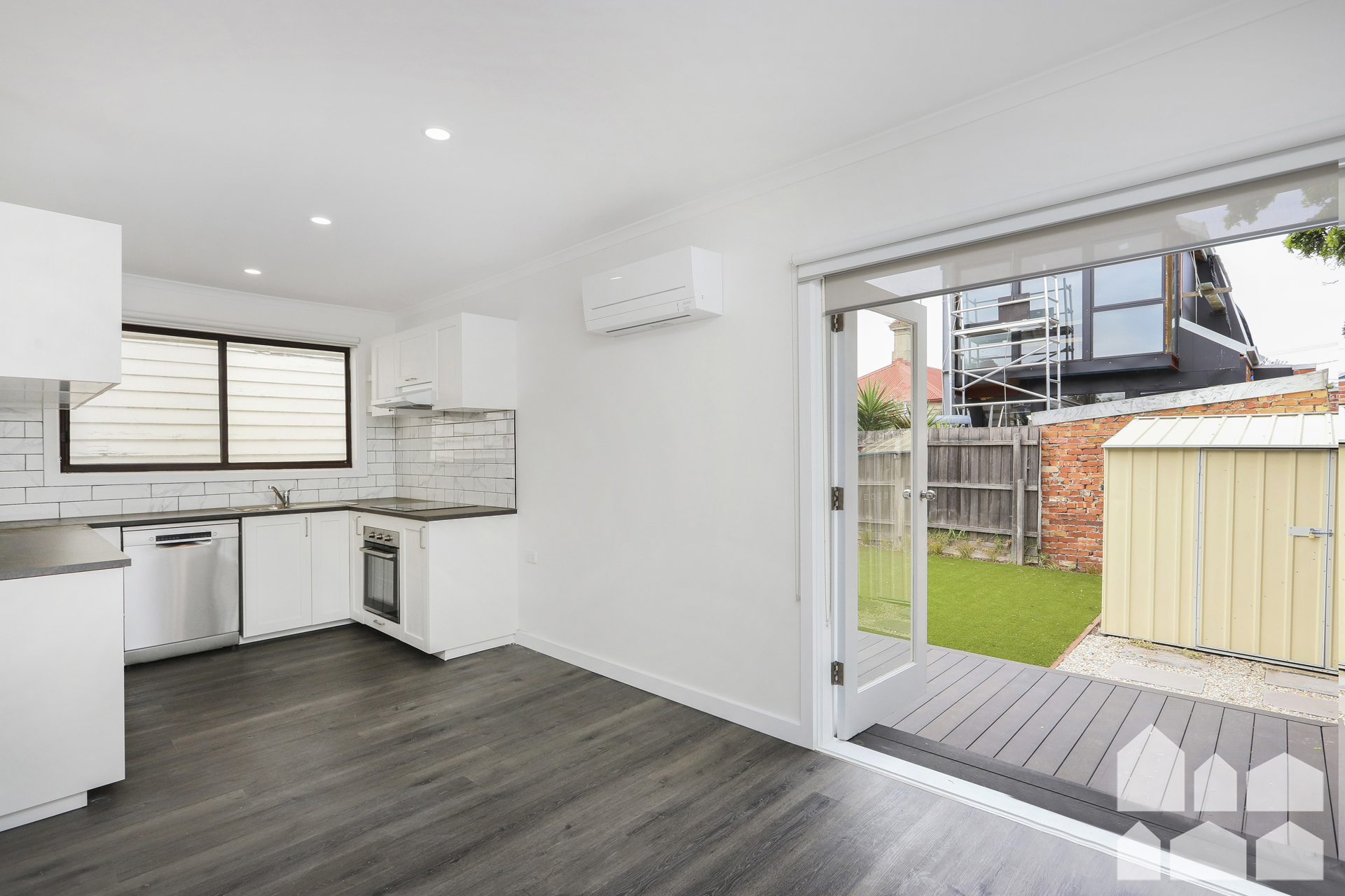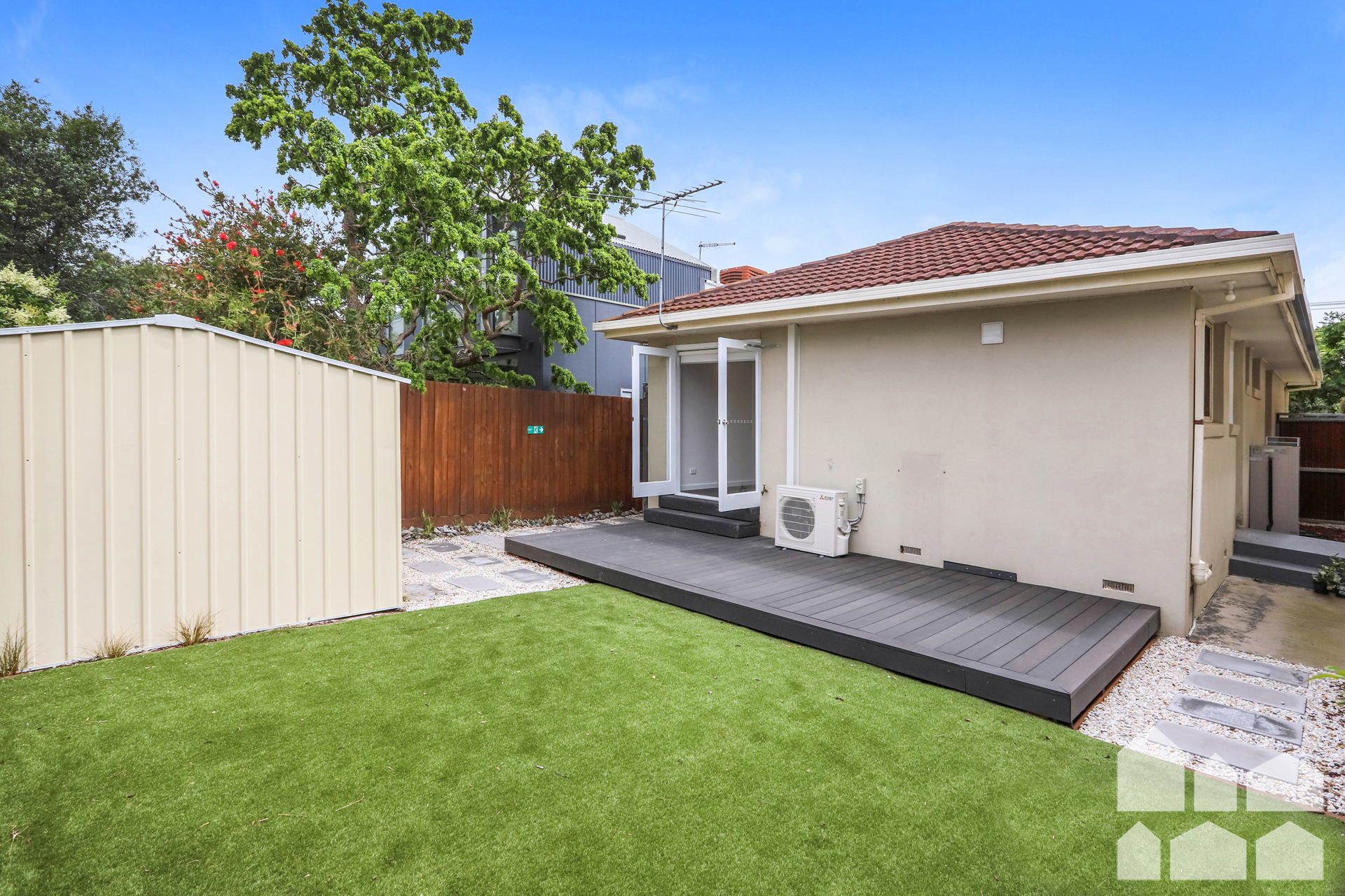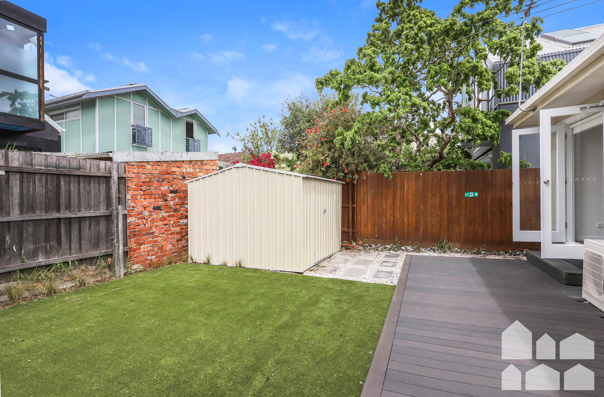 – Gorgeous rear yard with large deck, quality artificial grass and large shed