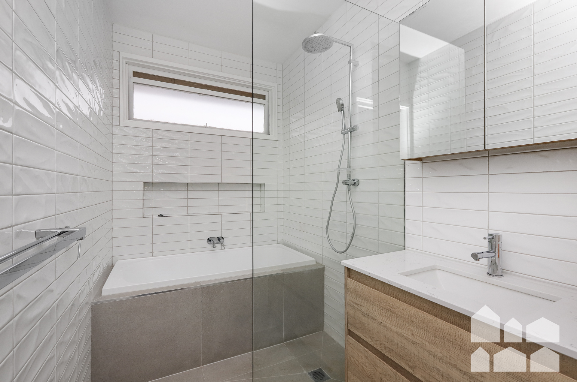 – Fully tiled bathroom with walk in shower and bath